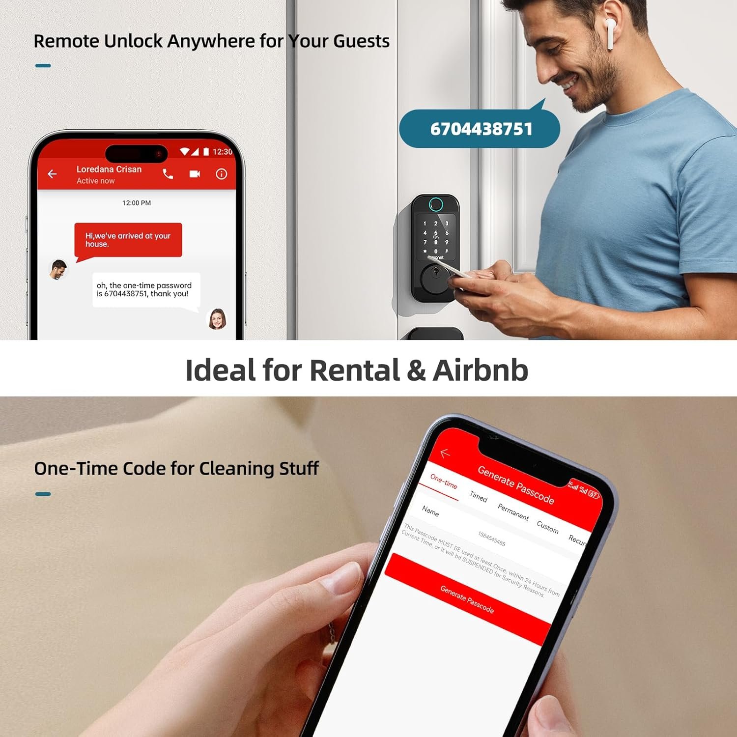 Designed for Rental & Vacation House: Generate temporary code for your short term rental guest. Keyless Deadbolt Lock can be added 100+ key fobs and share access with friends or guest. By authorizing users, family members can also manage the keyless entry door lock through their individual app accounts. Ideal for Rental, Vacation Home, Beach House.