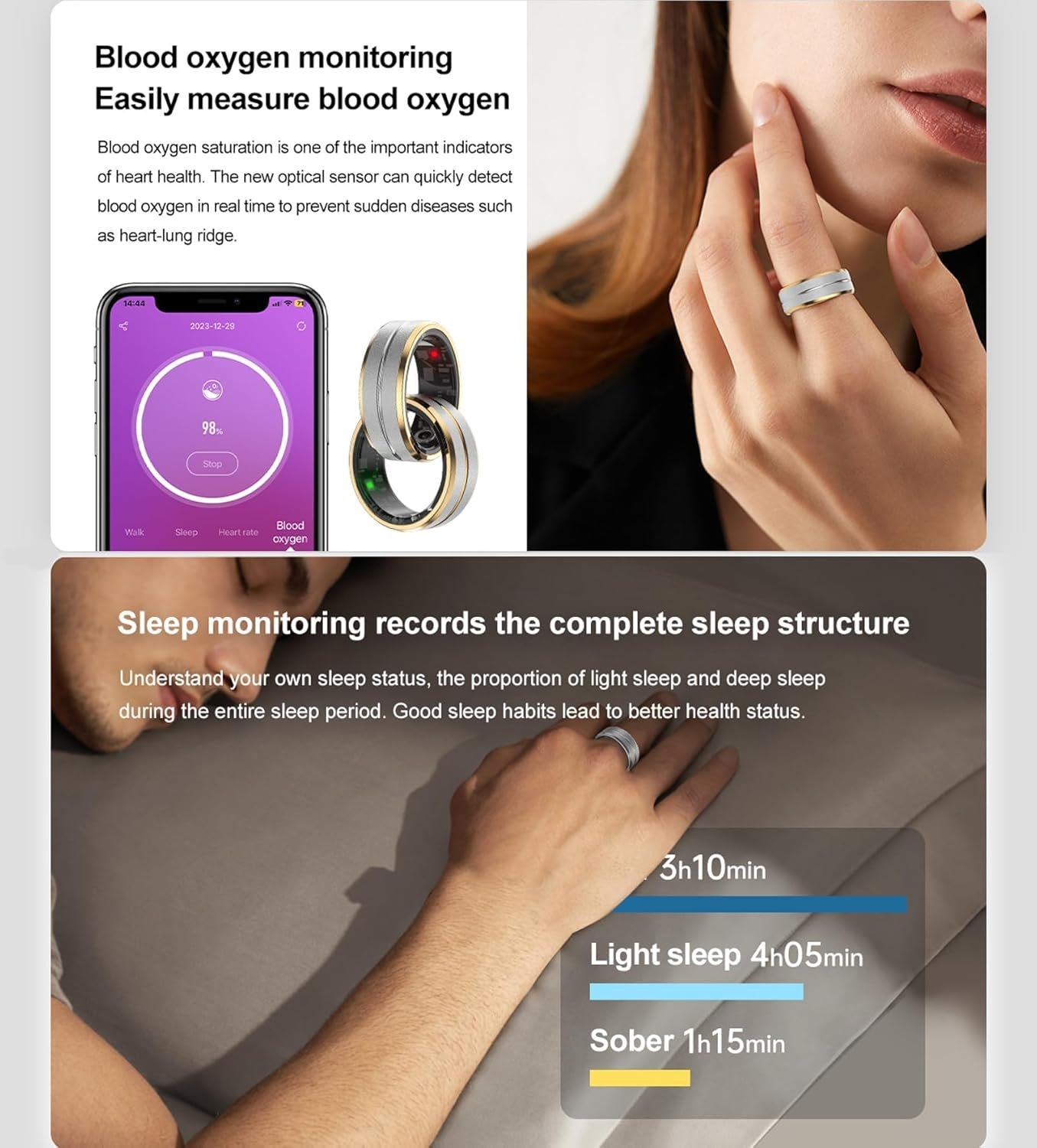 Smart Health Ring: The smart ring supports 24-hour continuous heart rate monitoring. An automatic sleep tracker can monitor your sleep status and provide a comprehensive sleep quality analysis (deep sleep, light sleep, and wake-up time), allowing you to develop good sleeping habits.