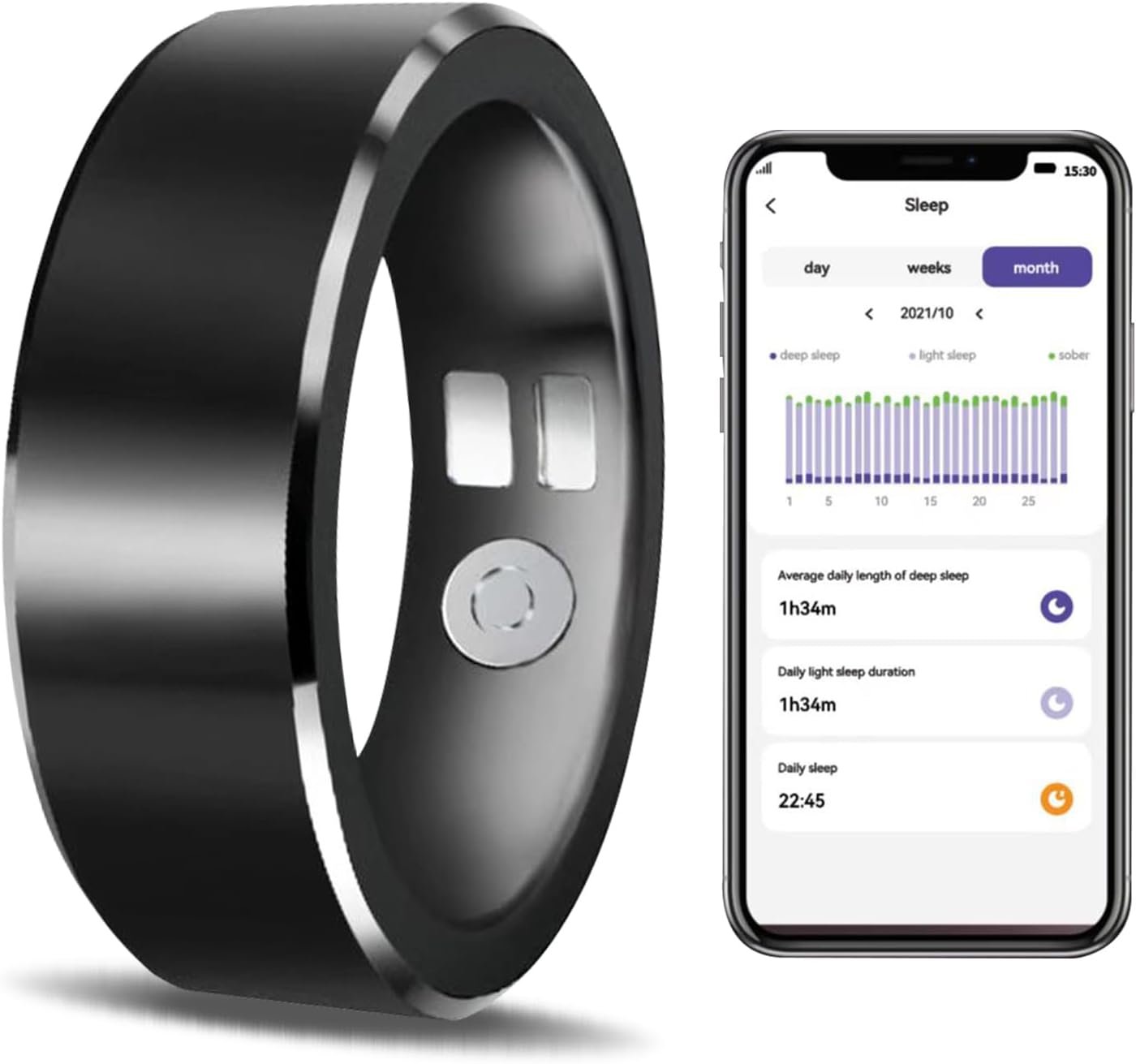 【Sleep Monitor & Sleep Score】Smart sleep tracker ring monitors your sleep and analyzes your sleep quality through Deep Sleep, Light Sleep, Awake stage, gives you a nightly sleep score in the app, leading a healthy lifestyle. 24/7 Heart Rate & Blood Pressure Monitor:This blood pressure ring supports real-time dynamic heart rate, blood oxygen saturation, blood pressure ,temperature monitoring so you can know more about your physical condition