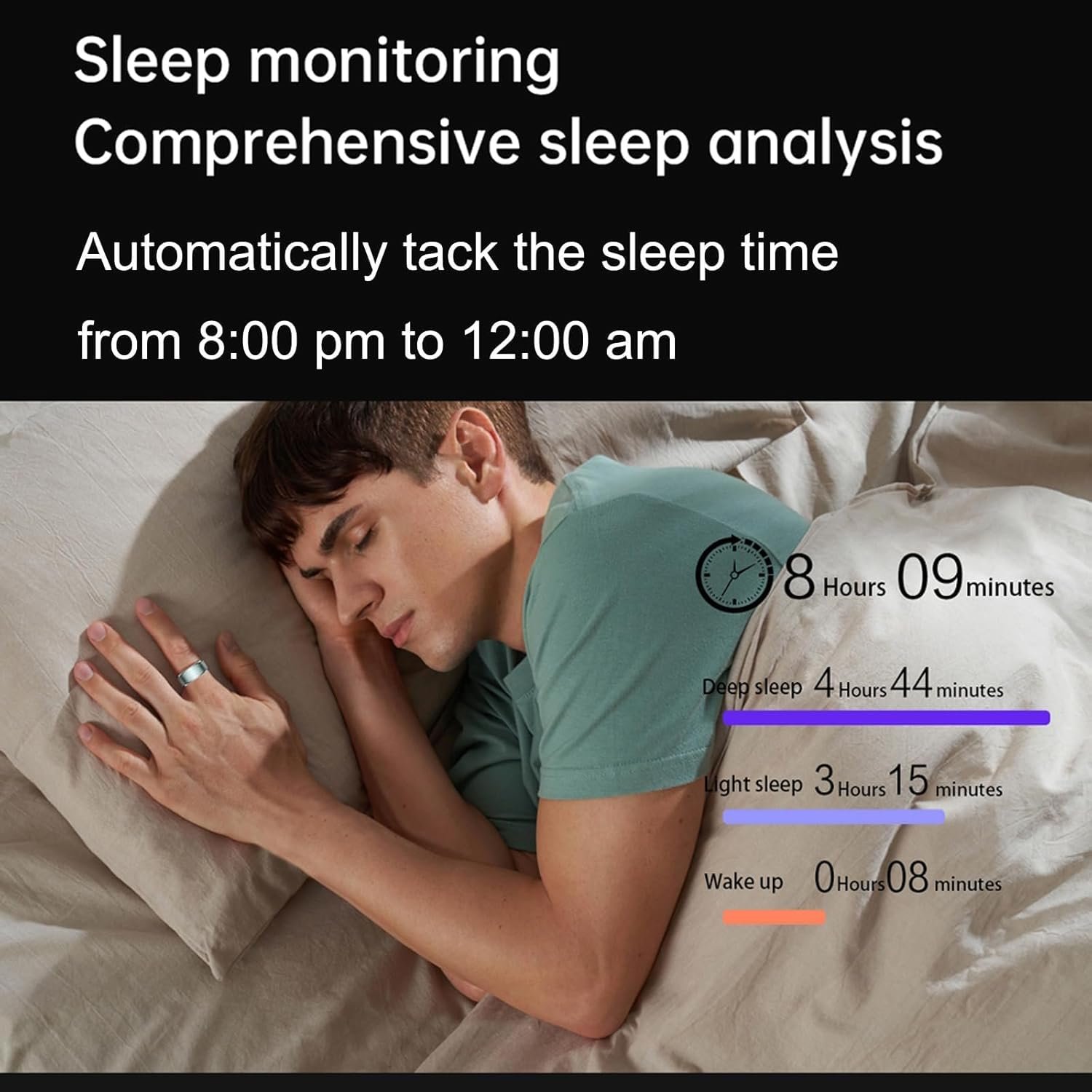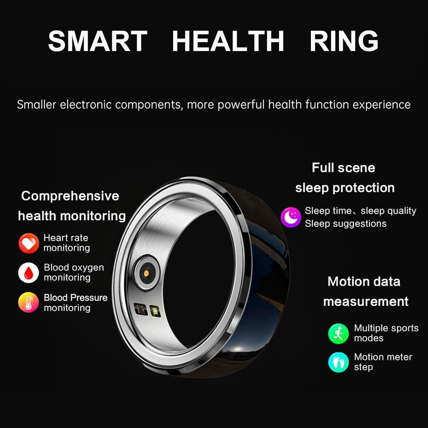 Smart Health Ring: The smart ring supports 24-hour continuous heart rate, also monitor your real-time blood pressure at any time with one click on the App.An automatic sleep tracker can monitor your sleep status and provide a comprehensive sleep quality analysis (deep sleep, light sleep, and wake-up time), allowing you to develop good sleeping habits.