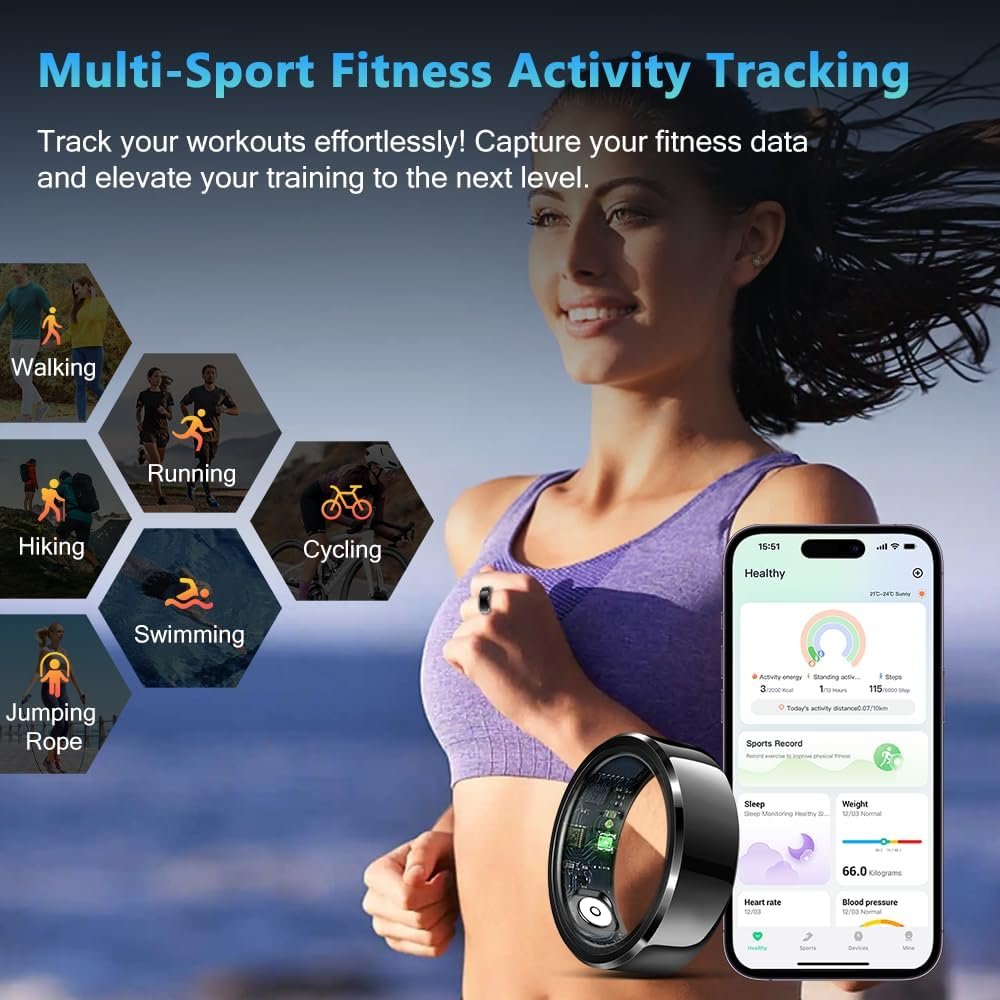 Multi-Sport Fitness Activity Tracking: Track and analyze your performance across a wide range of sports and fitness activities, including walking, running, cycling, hiking, swimming, jumping rope, and more. This health ring monitors your daily steps, total distance traveled, calories burned, and active minutes, providing you with in-depth insights into your physical activity. With real-time tracking, you can stay motivated and continuously optimize your workouts for maximum results.