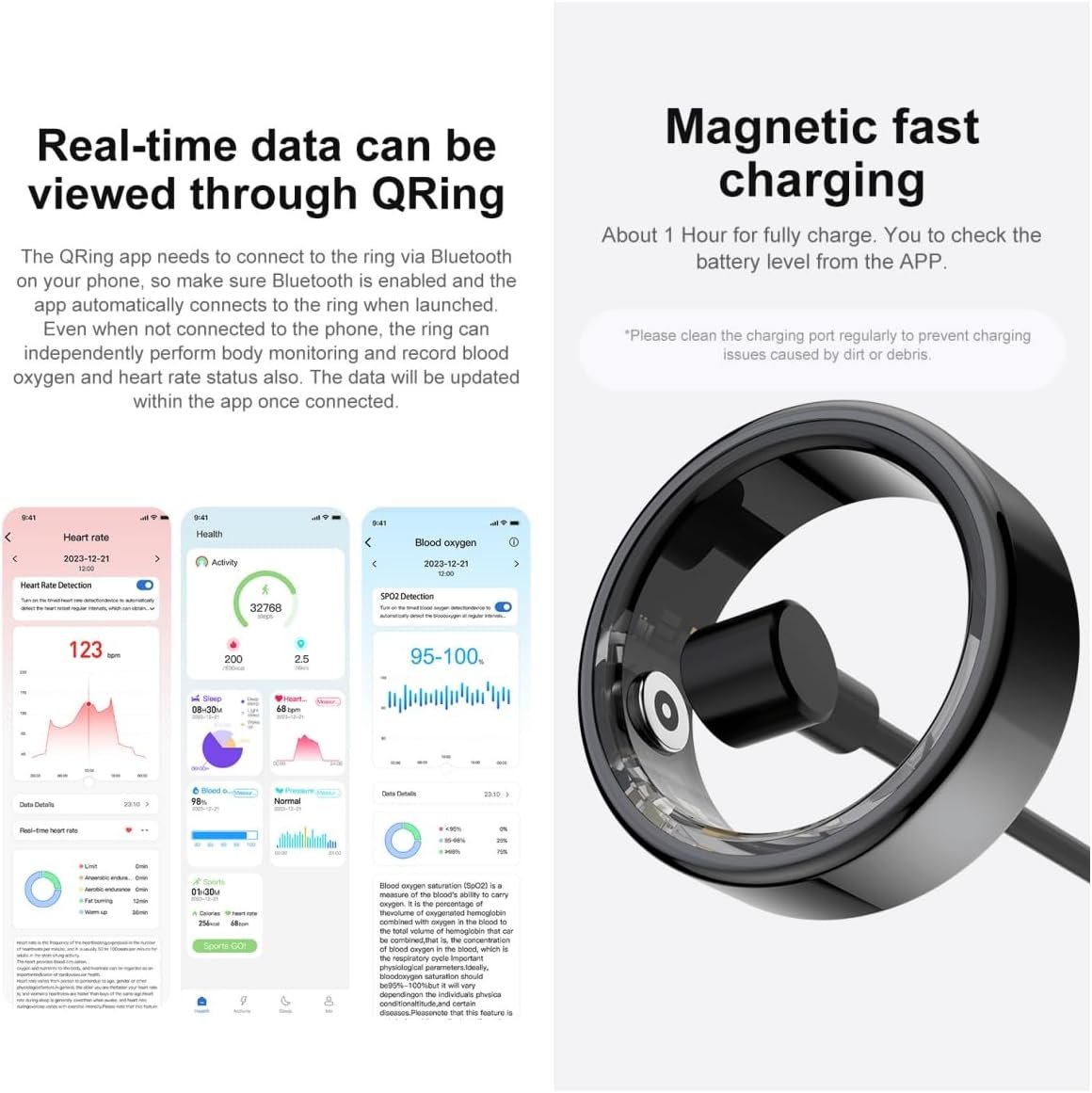 【Smart Ring: All Day Monitoring】This smart ring utilizes energy-saving technology to ensure continuous monitoring for 3 to 5 days without recharging. Made of medical grade stainless steel for comfort and waterproof to IP68 for longevity.