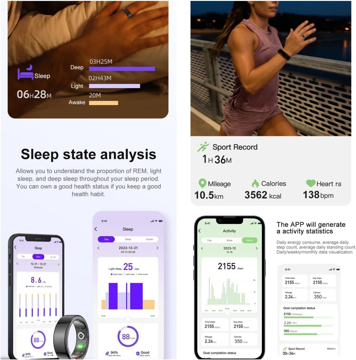 【Sleep Ring: Comprehensive Sleep Analysis】Comprehensive understanding of sleep behavior and physical condition by analyzing sleep efficiency, latency, time, stage, movement and more. The sleep tracking feature makes it an ideal health companion.