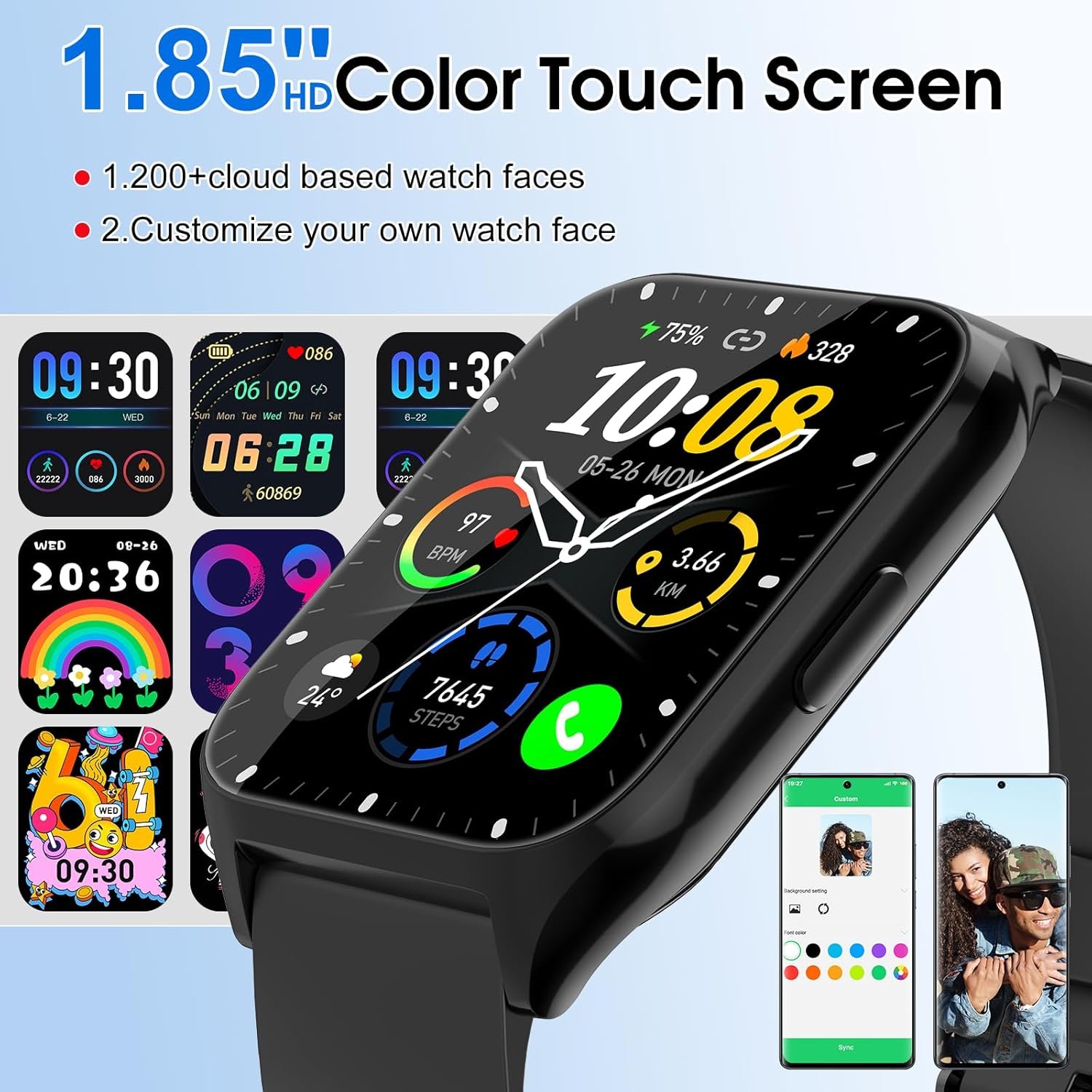 1.85-inch HD Screen and 200+ Customized Dials: With 1.85″ HD touch color screen, the smart watches for men is designed with clear and bright display, providing you with high-quality touch and visual experience. 4 levels manually adjust the brightness, so you can clearly see the displayed time and exercise data even in direct sunlight. You can choose from over 200 designs of watch faces of smart watch for men and women, or customize your favorite picture as a dial to match your daily mood.
