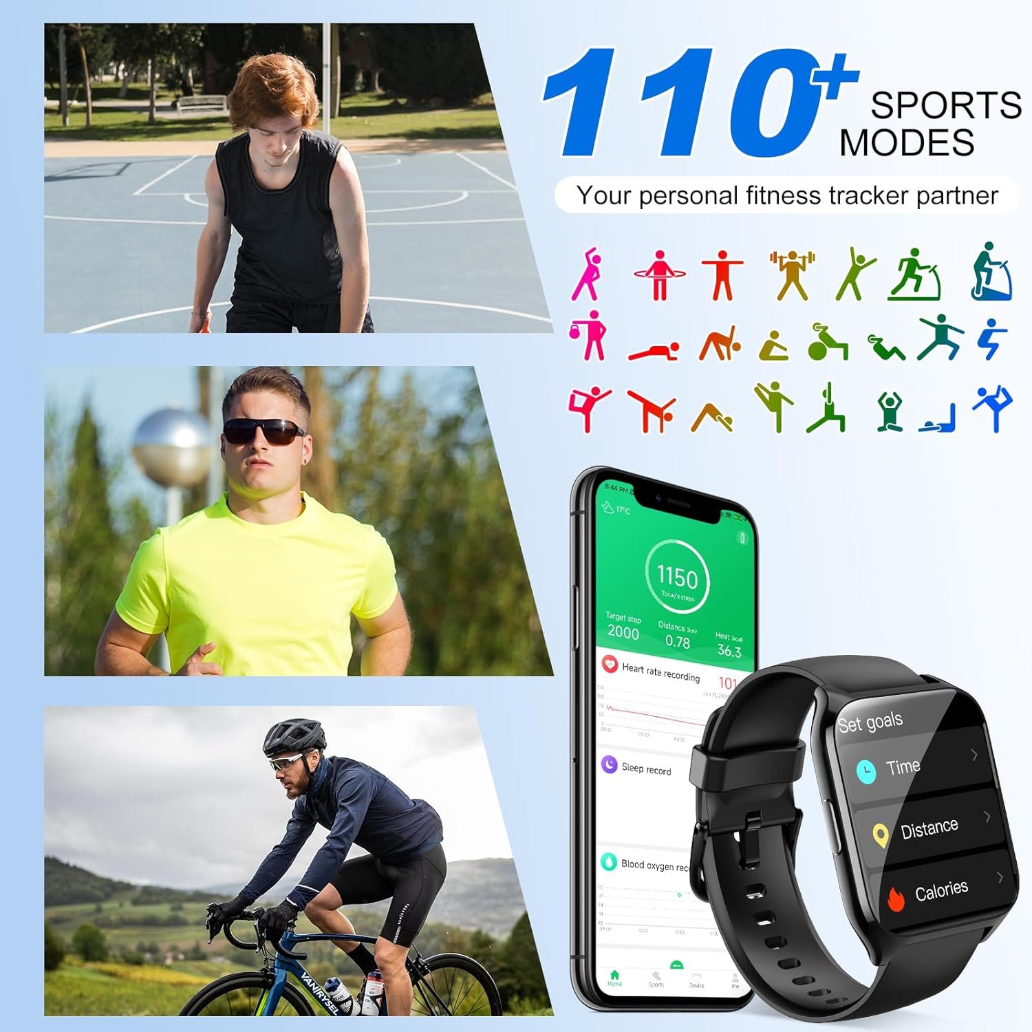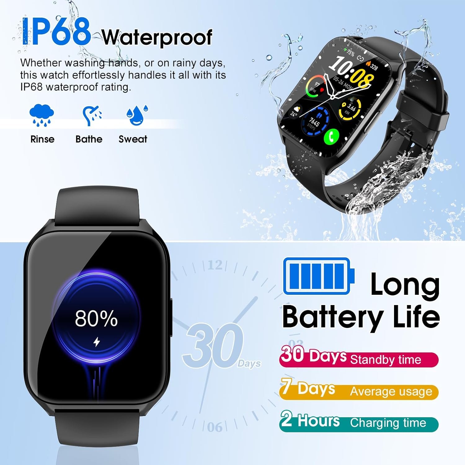 100+ Sport Modes and IP68 Waterproof Smart Watch: The fitness watch supports over 110 sports modes, including running, walking, hiking, badminton, basketball, boating, climbing, cycling, fitness, soccer, yoga, and more. This allows you to accurately track your exercise time and calories burned, helping you maintain a healthy balance between activity and rest. With an IP68 water and dust resistance rating, the sports watch activity tracker can withstand sweat, hand washing, or rain.