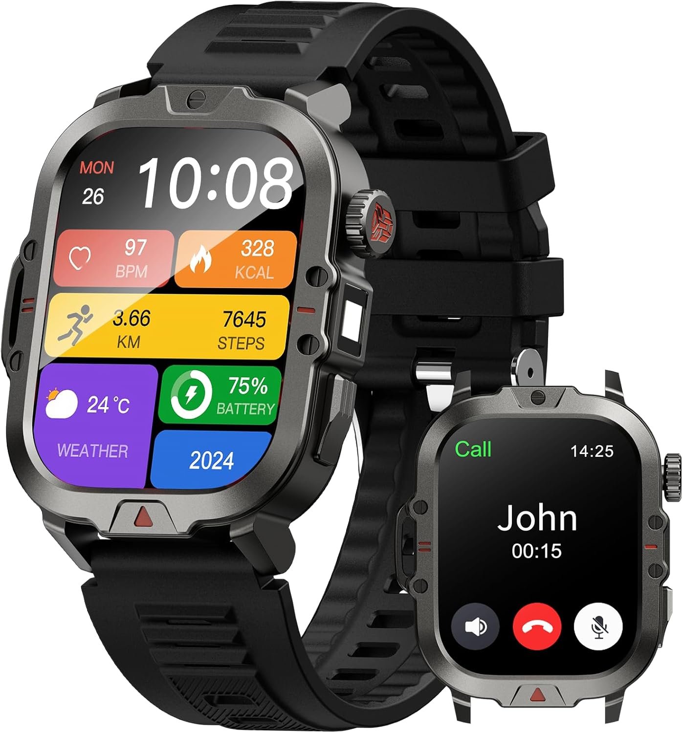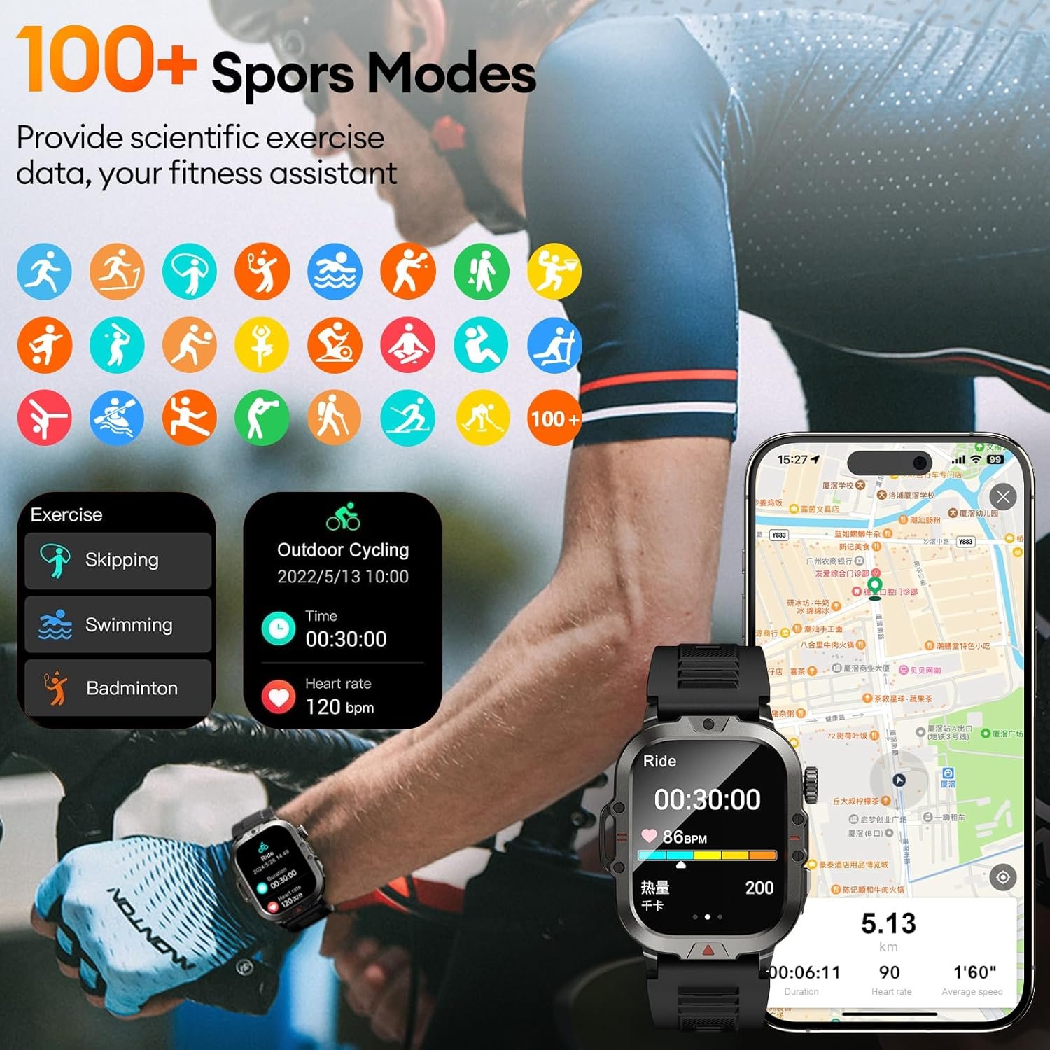 【Over 100 sports modes】The military smart watches for men supports various sports modes such as running, cycling, climbing, basketball, rowing, skiing, etc. During exercise, it records your heart rate, steps, calories burned, and other information to help you achieve your fitness goals. With IP68 waterproof functionality, it ensures worry-free use even when worn outdoors, in the rain, while washing hands, or sweating