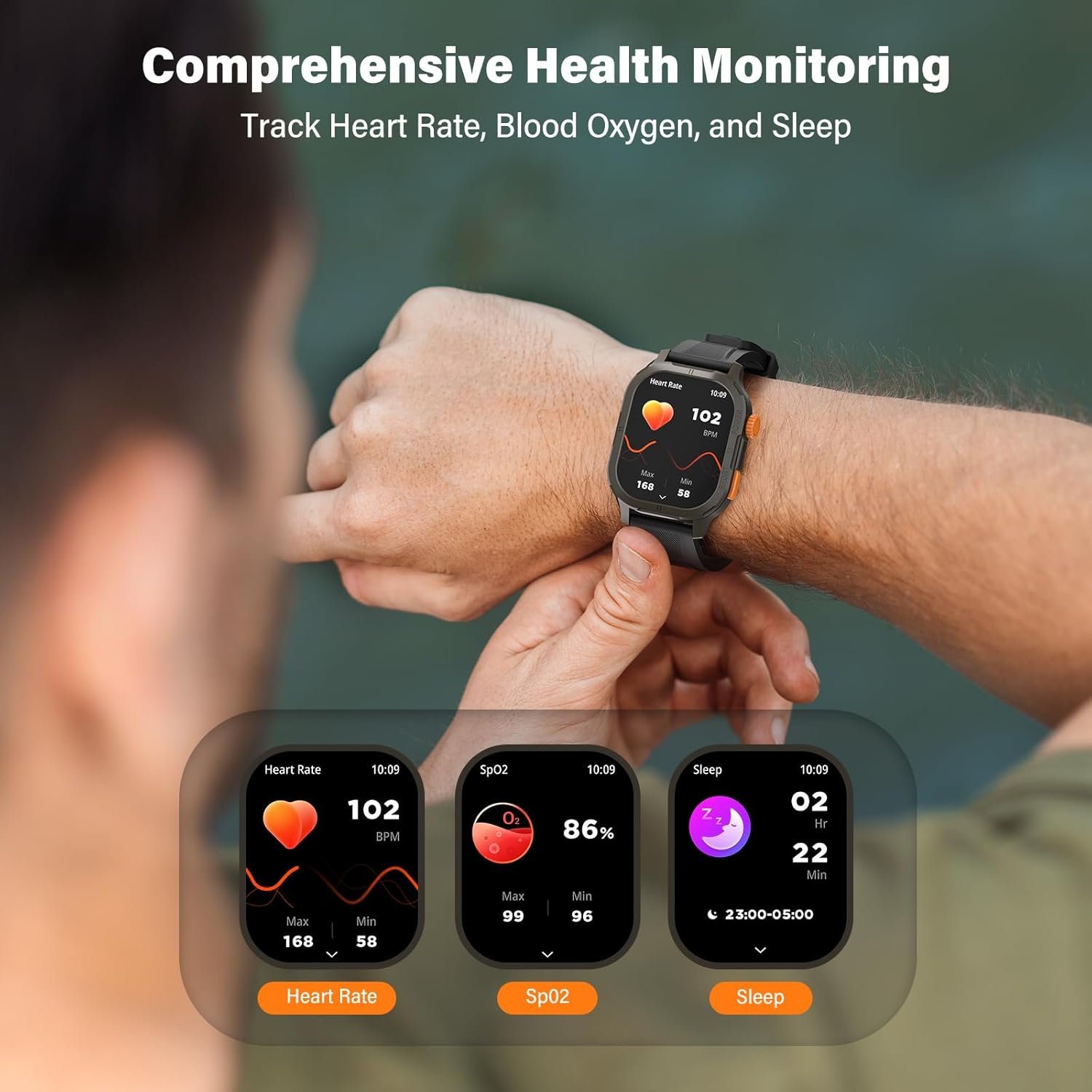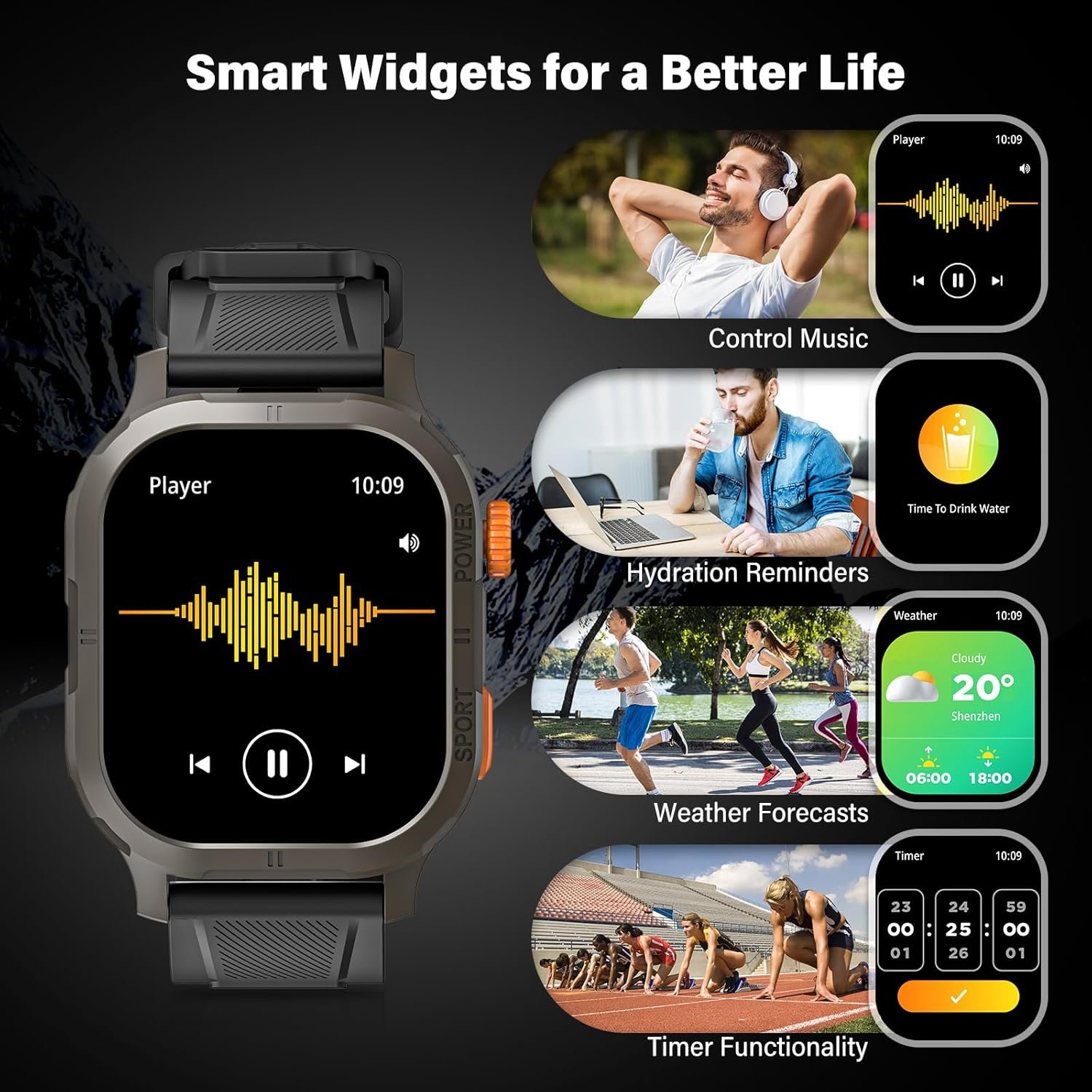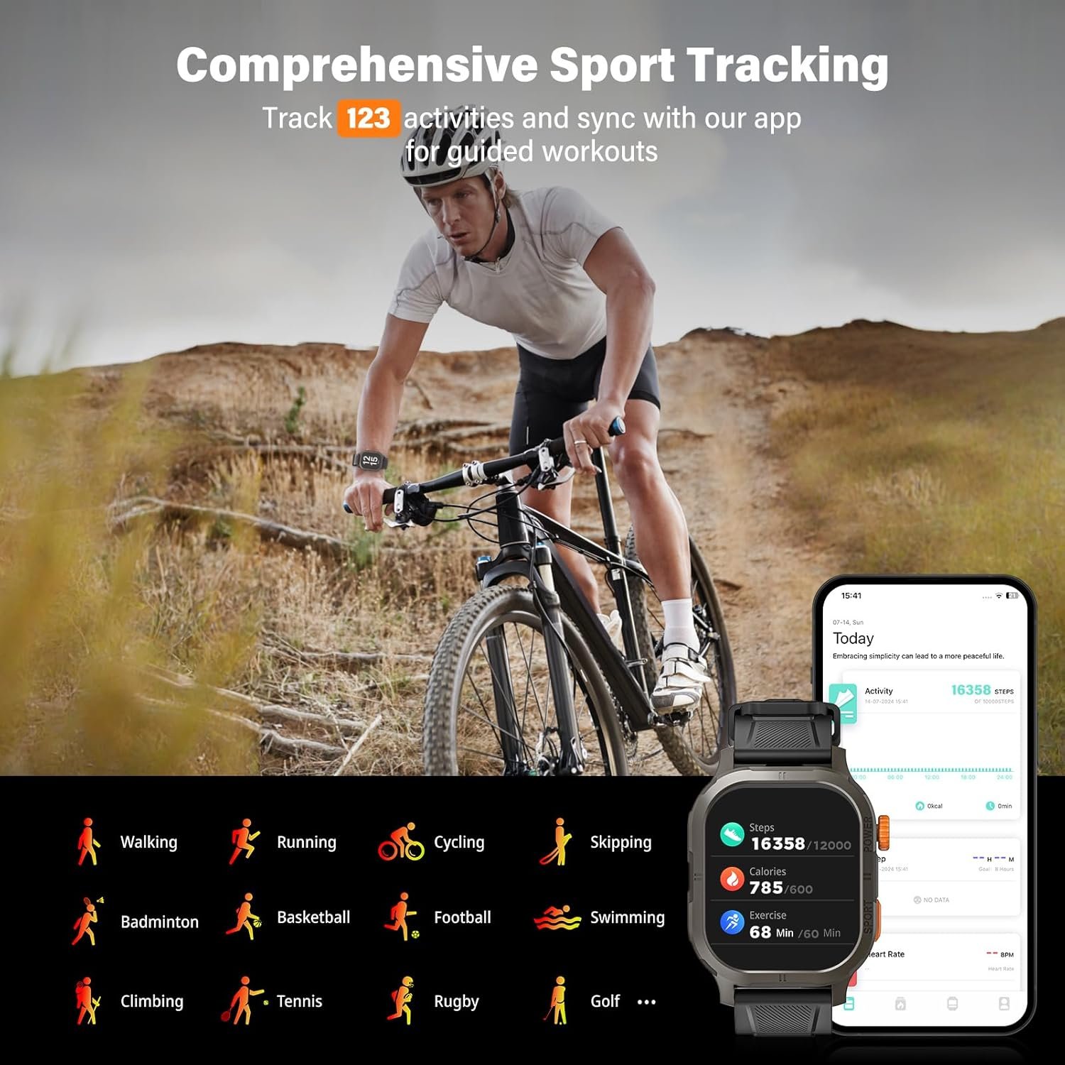 Your Ultimate Fitness Tracking Partner-Elevate your fitness journey with our smartwatch, designed to support 123 sport modes including sport running, hiking, climbing, cycling, and swimming. Waterproof and built for endurance, it accurately tracks your performance and seamlessly syncs data with Apple Health and Strava. Enhance your workouts with integrated music control, hydration reminders, and real-time weather updates. Perfect for both dedicated athletes and outdoor enthusiasts, our smartwatch keeps you motivated and on track to achieve your fitness goals