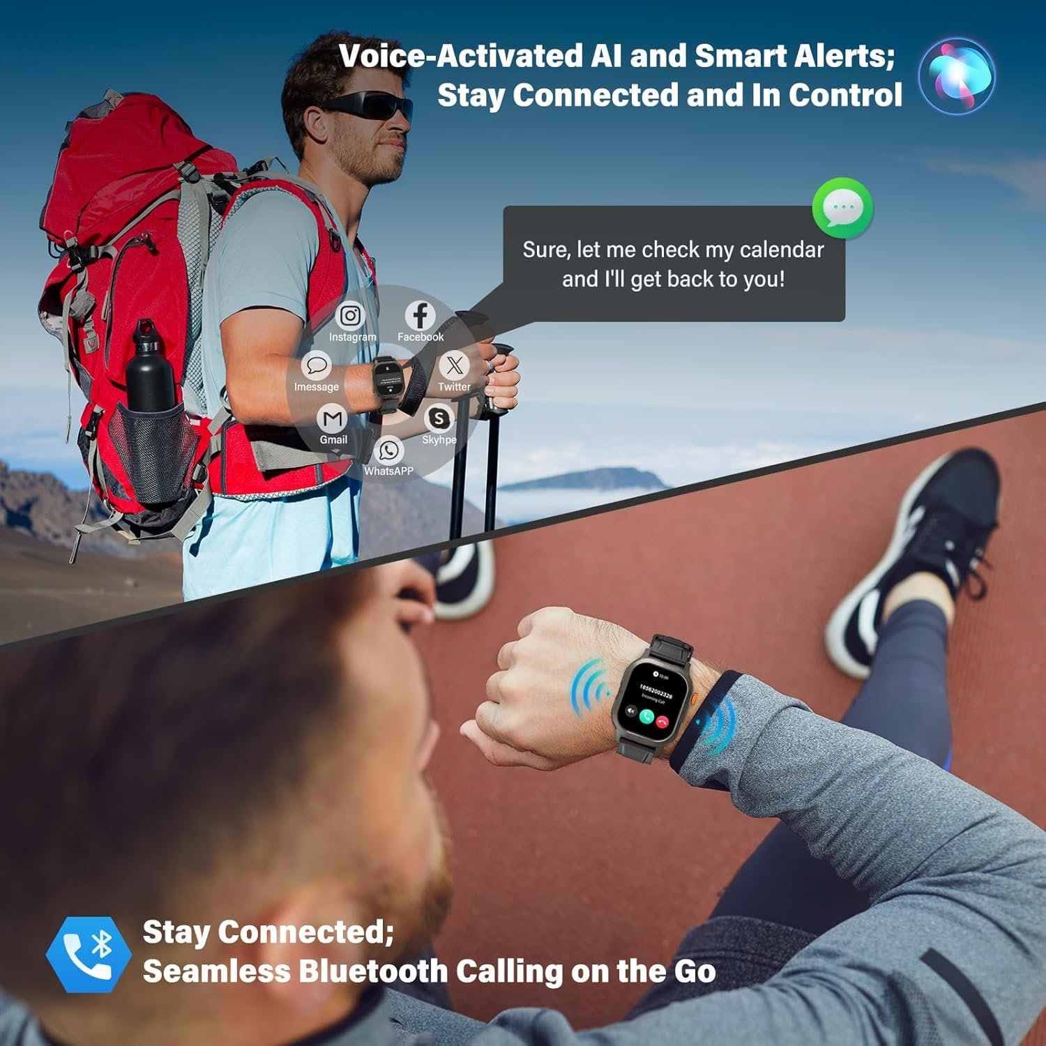 Smart Connectivity at Your Fingertips-Stay connected on the go with our smartwatch’s Bluetooth calling feature, allowing you to make and receive calls directly from your wrist. Use the built-in AI voice assistant to control your smartphone via the smartwatch, enabling hands-free commands for a truly seamless experience. Stay updated with smart notifications, including messages, hydration reminders, and alarms, ensuring you never miss an important update. Designed for ultimate convenience, our smartwatch integrates intelligent reminders and hands-free communication, enhancing your everyday life with effortless connectivity and control