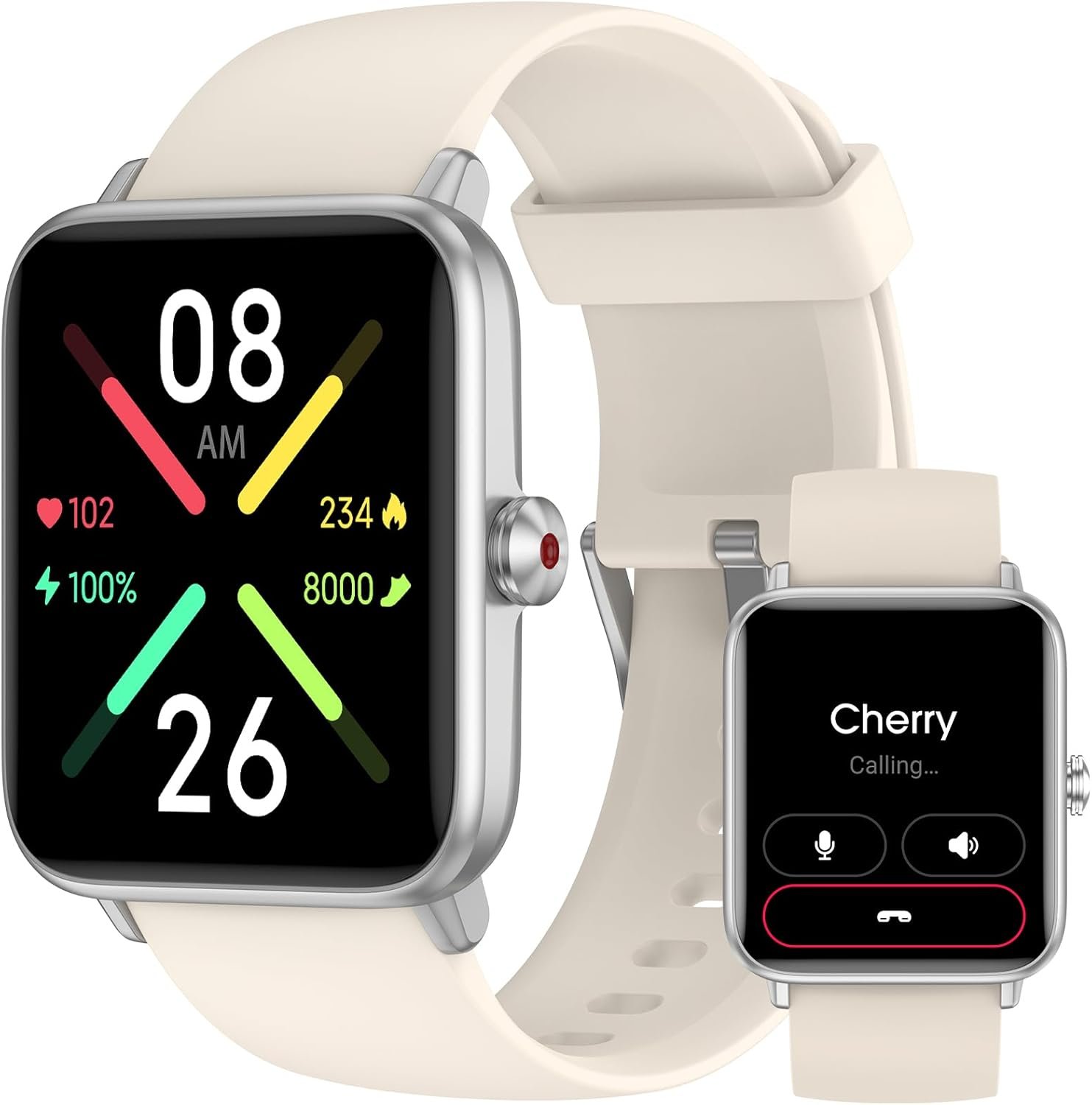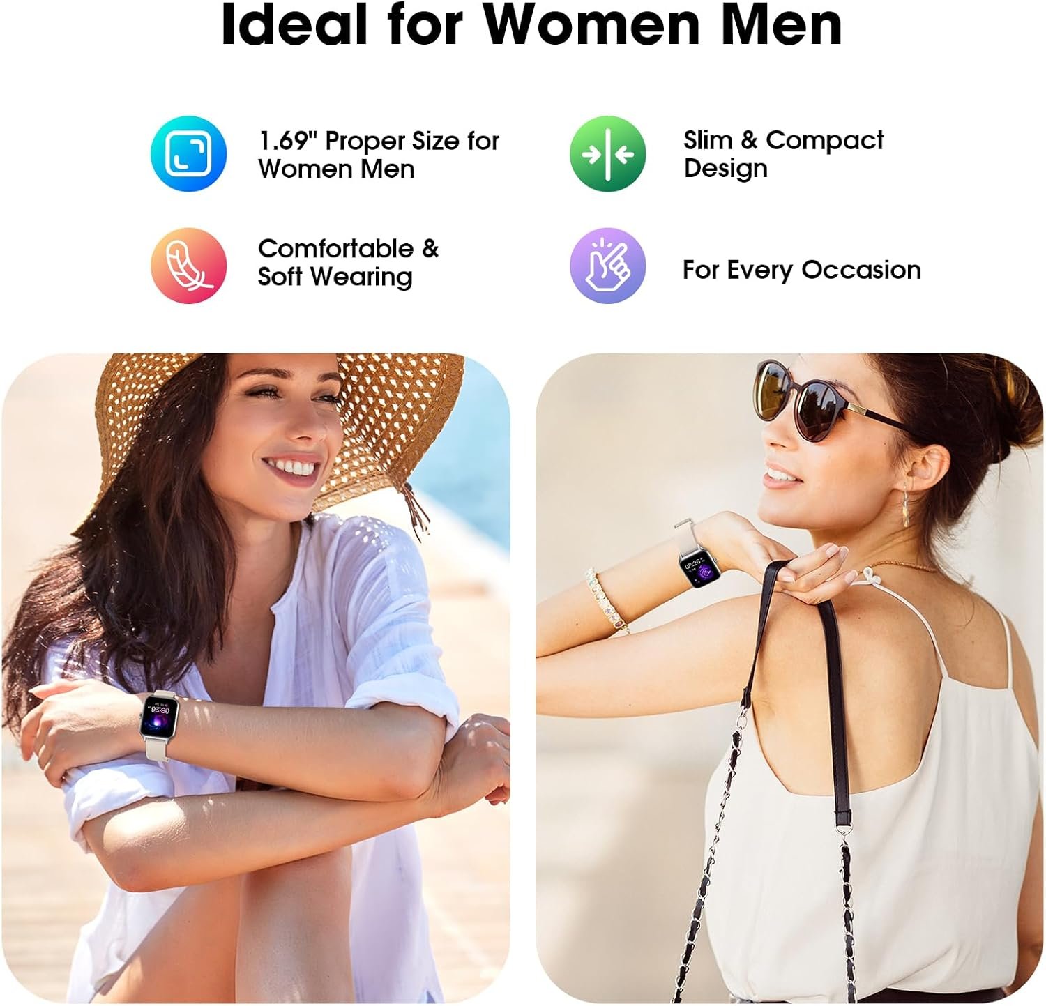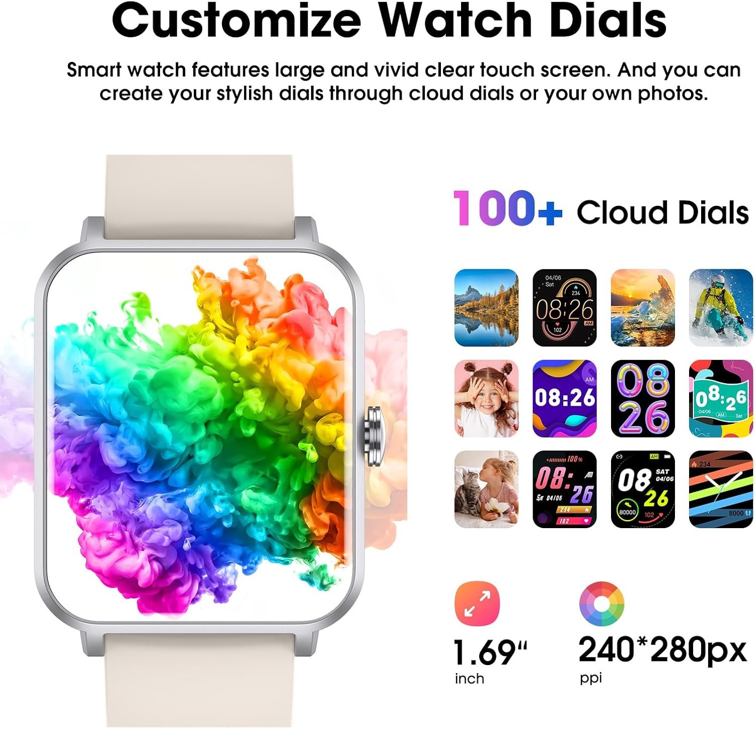 This smart watch features 1.69 inch display; High contrast and saturation offer clear and vivid visuals; The fitness watch features over 100 cloud watch faces; You can set up exclusive watch dials through your photos album as well