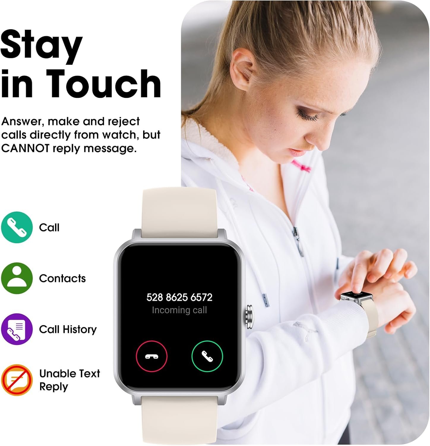 The smart watch can receive notifications from SMS or App; You won’t miss important information from your lover or friends, making your life and workout more concise and intelligent; Please note that you cannot text on the watch