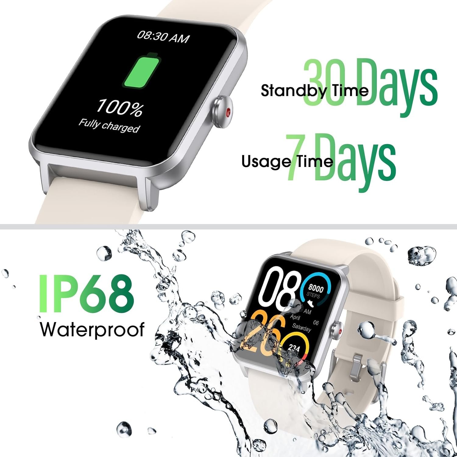 The smart watches only take 2 hours to fully charge and last for up to 7 days of continuous use or 30 days standby time; The fitness tracker watch is compatible with most iOS 10.0 or Android OS 5.0 or higher smart phones (Not for tablets or computers)