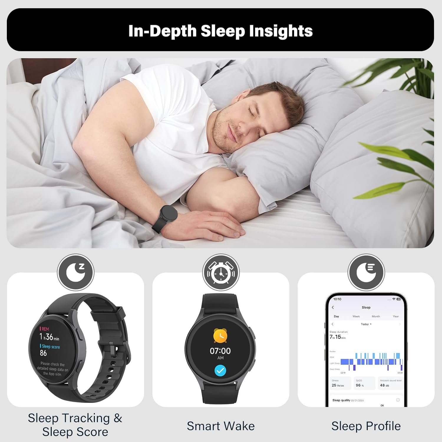 Advanced Health Monitoring: Stay on top of your health with continuous tracking of your heart rate, blood oxygen levels, stress, and sleep quality. The smartwatch also features HRV monitoring, which provides insights into your heart’s responsiveness to stress, and noise detection for a safer environment. Women’s health is specially catered to with dedicated tracking for menstrual cycles, ovulation periods, and other vital health metrics, offering a personalized health management experience