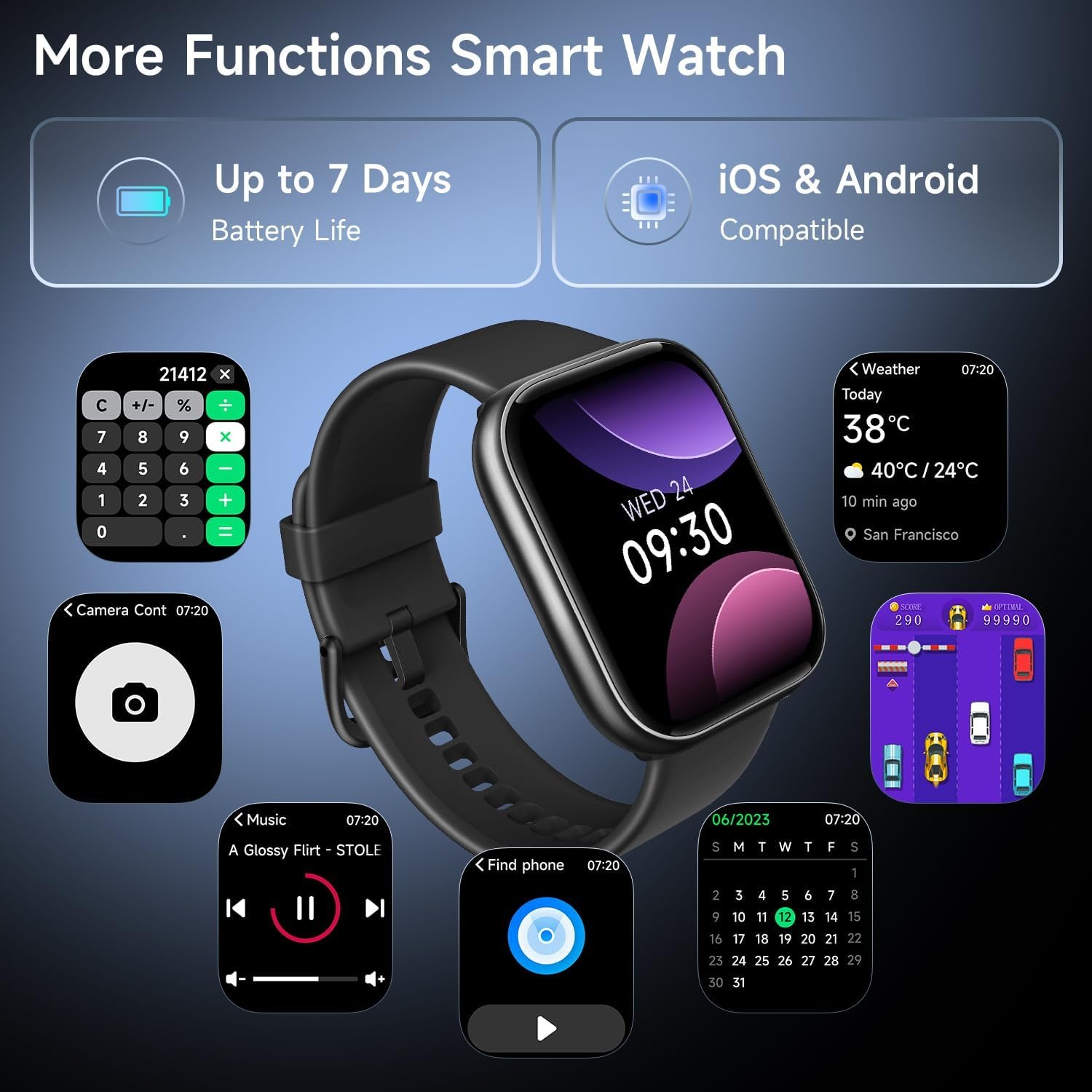 The upgraded buttons are no longer decorative. In addition to using the touch screen, the 360° rotating function button on the smartwatch helps you switch any interface at will. Our smart watch for android phones has more function, such as calculator, music, weather, mobile phone search, games, etc.