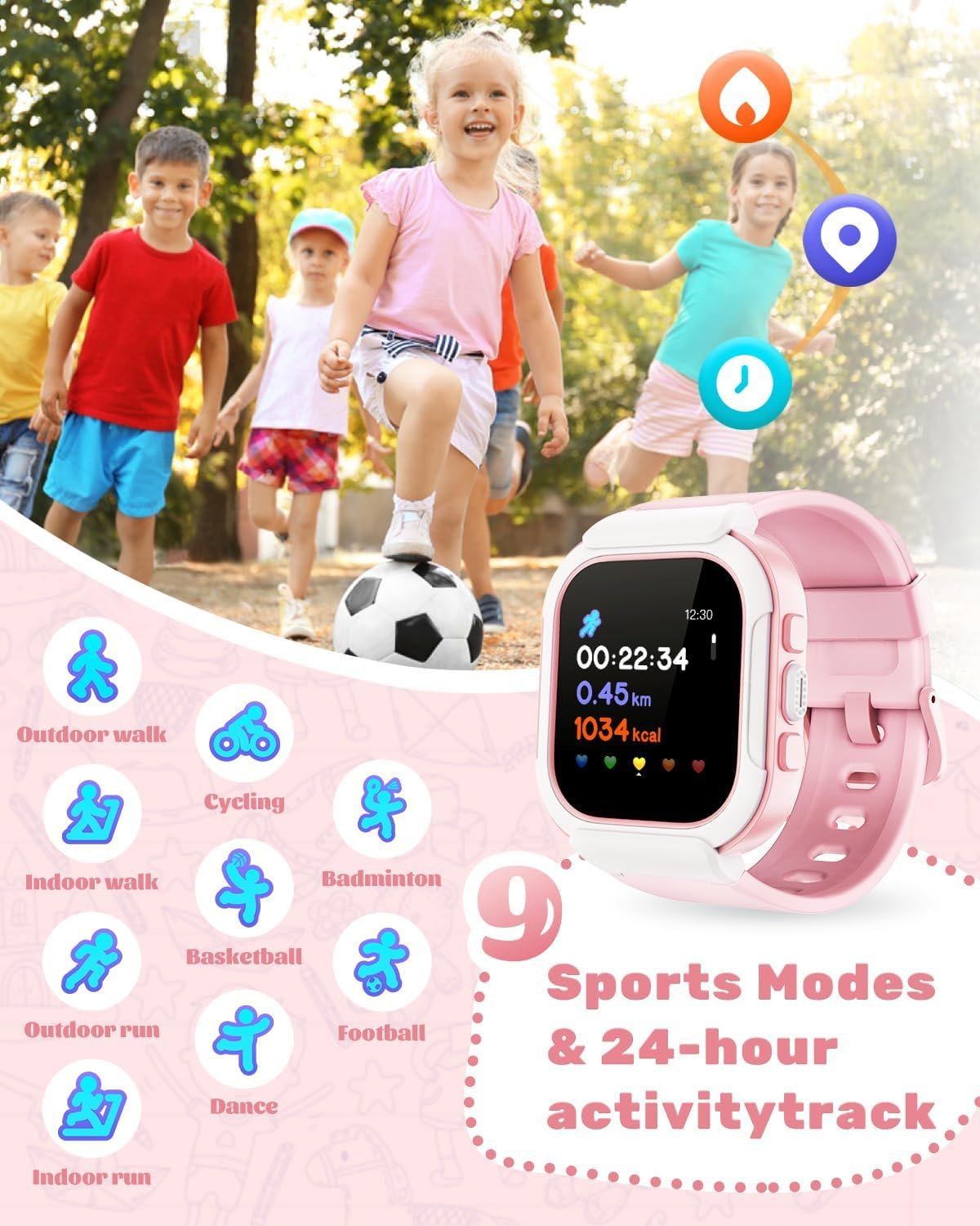 【All-day Activity Tracker】- This smart watch is compatible with most iOS 8.0 & Android 4.4 or higher smart phones(Not for PC or tablet). Supports 9 activity modes. Automatically counts your kids steps, distances and calories burned. It can encourage kids to build good sports habits and be more healthy.