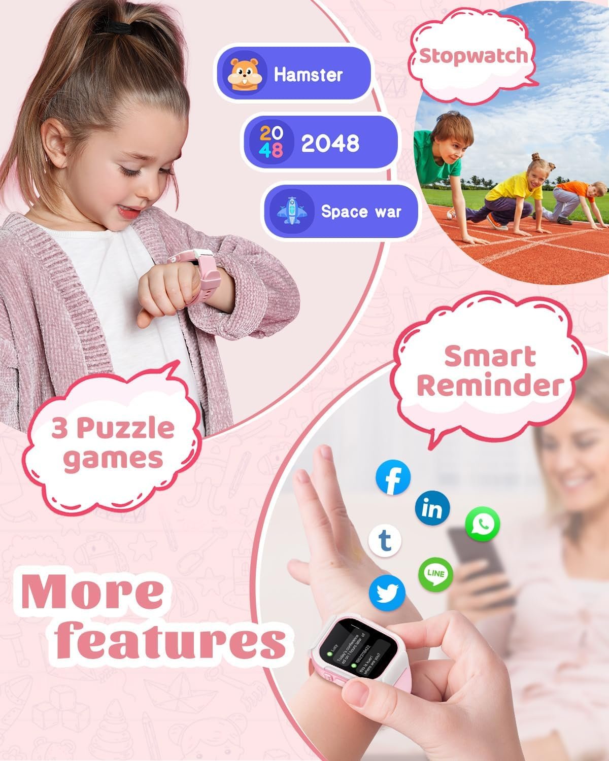 【Puzzle Games & More Practical Features】- The latest kids watch has three puzzle games to help you better enhance your kids thinking ability and improve their intelligence. Also, it has more practical features, such as calculator, alarm clocks, stopwatch, deep breath guide, music control, smart reminder.