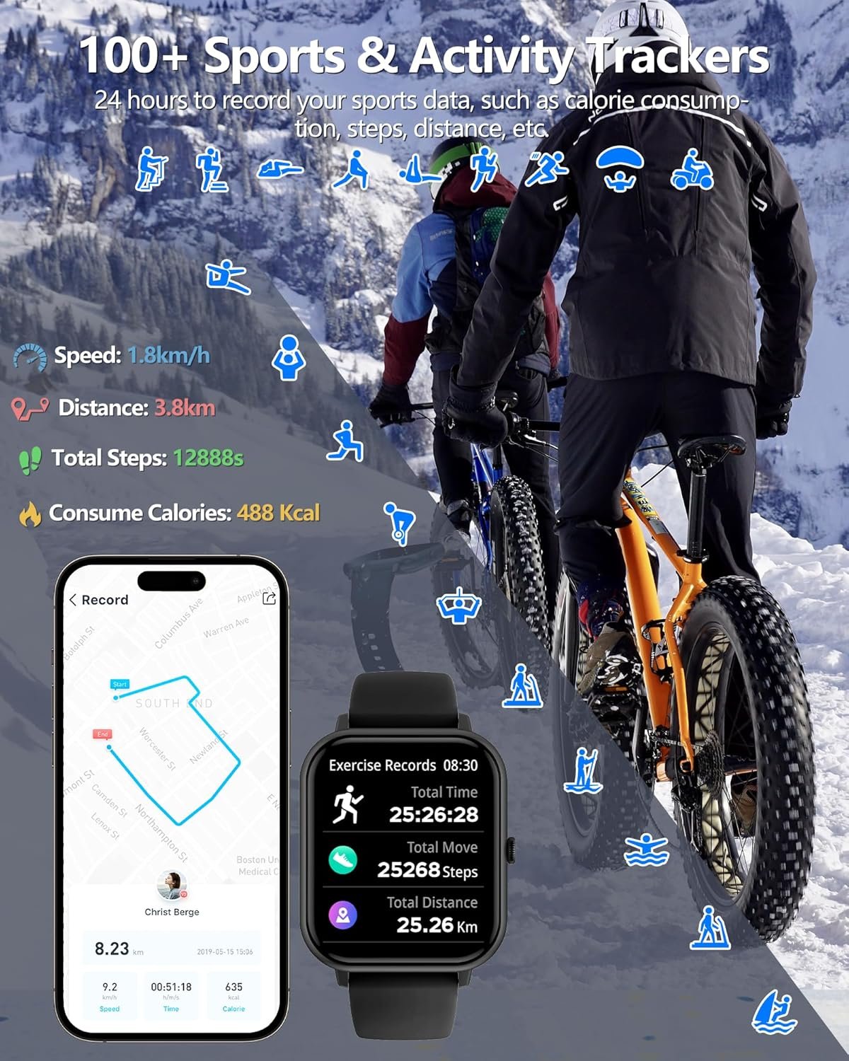 【24/7 Health Monitoring & Activity Tracking】This fitness watch can track heart rate and blood pressure in real time 24 hours a day, It analyzes your sleep quality when you enter sleep mode and provides effective suggestions to improve your sleep time and regulate your life.As a sports watch, it has 123 sports modes, which can record your all-day activity data, such as calorie consumption,steps,activity track,etc.