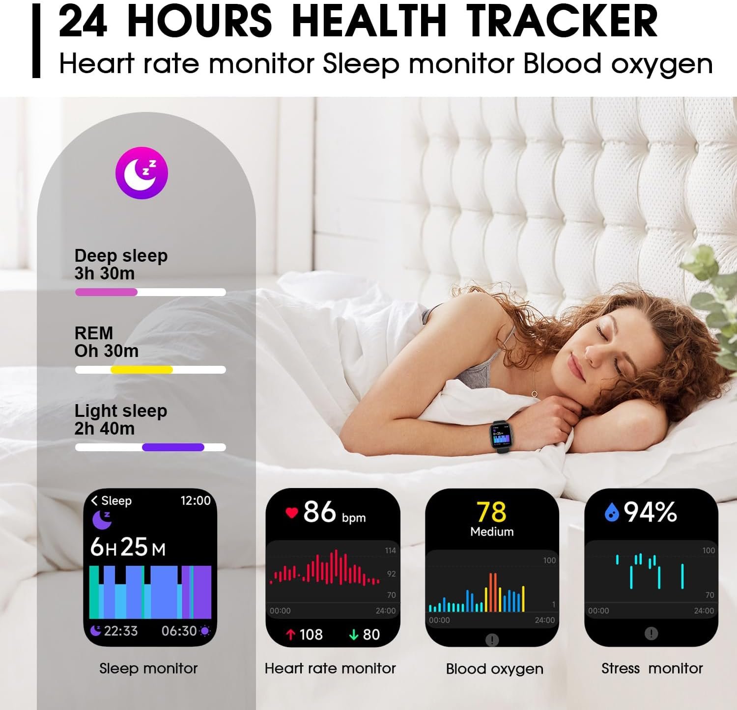 【24/7 Health Monitoring Fitness Watch】The sports watches for men provides 24-hour management of your health. The one-click measurement function can monitor your blood oxygen heart rate and blood pressure status. You can view this data directly in real time on your pedometer and more detailed data can be displayed in the app. Also, the smart watch for android phones tracks sleep cycles, providing information on the quality of your night’s rest, which will help you to lead a healthier life.