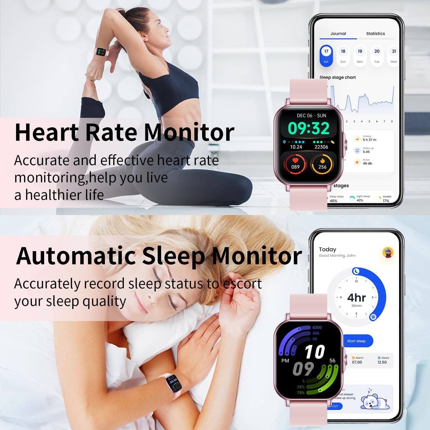 【Health Monitor on Wrist 】This smartwatch monitors your heart rate in real-time, and you can view the recorded data on the watch or application. The watch also allows for blood oxygen detection. In addition, the fitness tracker will automatically track your sleep status, including light sleep, deep sleep, and wakefulness time, helping you develop healthy sleep habits and improve sleep quality.