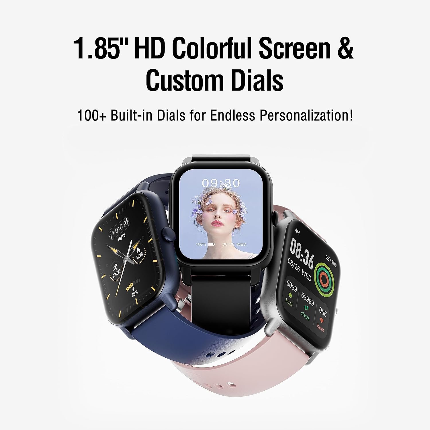 1.85-inch HD Display and Customizable Watch Faces: The smart watch for men women features a 1.85-inch large screen, providing clear and convenient viewing of time, date, weather, health data, and more. With over 100 stunning watch faces to choose from, you can personalize your fitness watch with your favorite designs. You can also design watch faces with your own pics. Additionally, the smart watches offers two different strap colors and styles to suit your individual preferences.