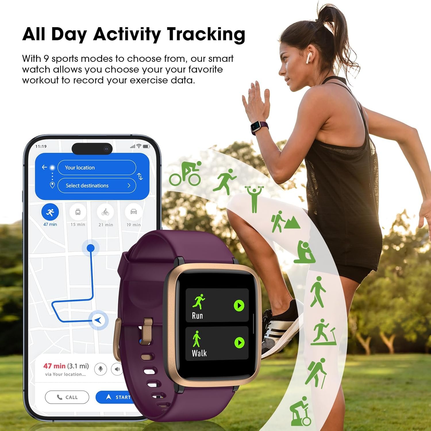 Multiple Sports Modes: The fitness watch has 9 exercise modes for daily workouts, such as walking, running, biking, swimming, etc.. It precisely records all-day activities, including your steps, distance, calories burned, and mileage. You can connect your smartphone GPS to your smart watch to track all your routes and distances during workout.
