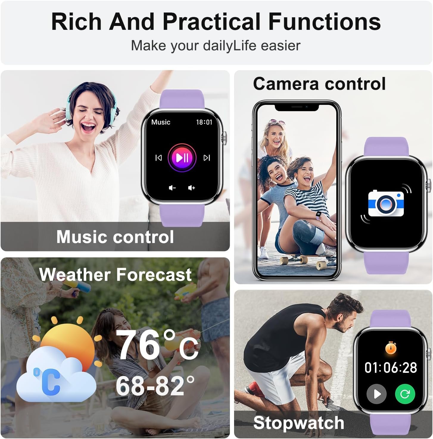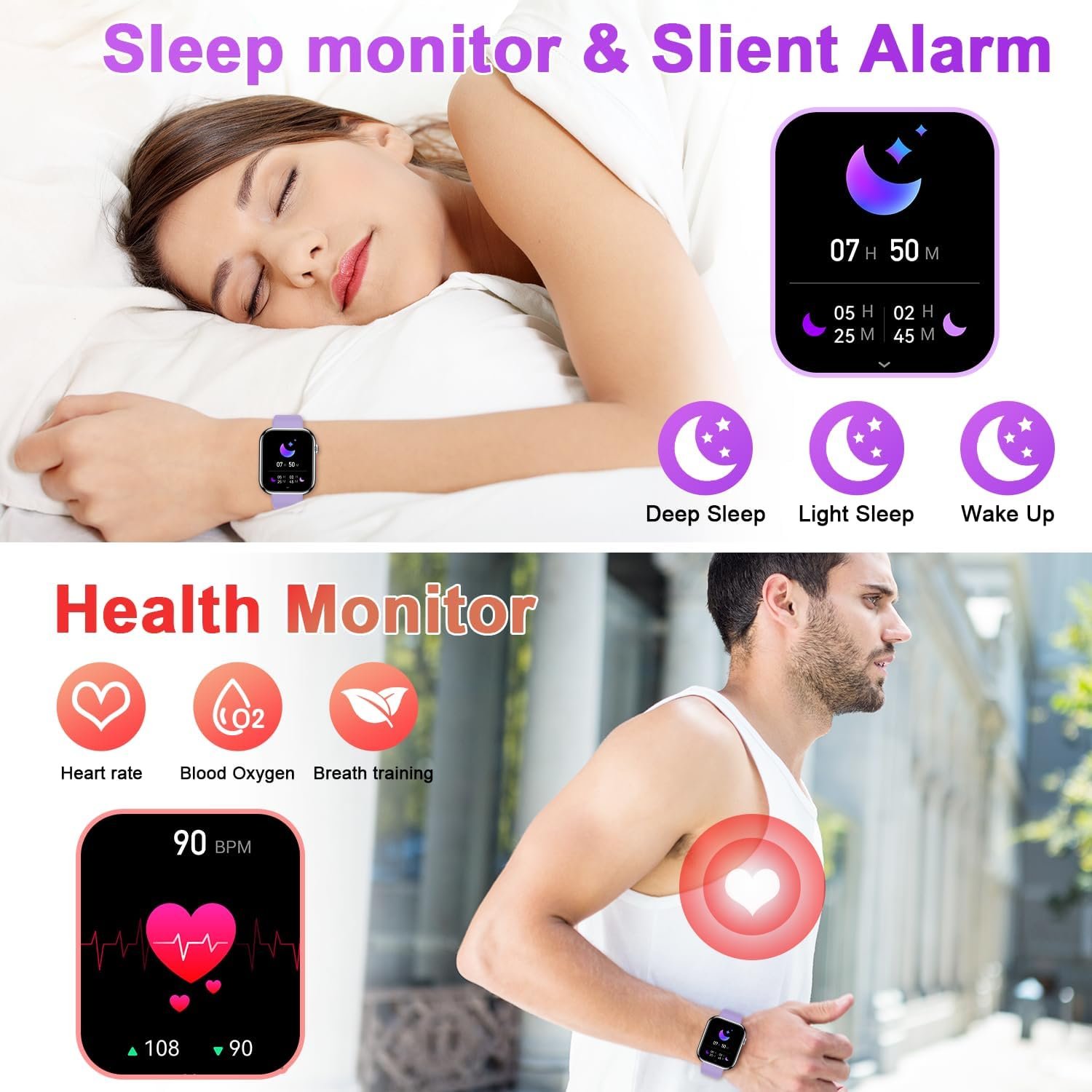 2 Watch Straps, 2 Wearing Styles: Smart watches for women men adopts a larger screen design, and come with two watch bands of different colors.(Receive/Dial) and message notifications can be displayed directly on screen.Smart watch for android phones contains many dials readily available to choose from along.You can also DIY watch faces with your own photos.Smart watch for iphone compatible can be any photo,such as your family,pet,et.ios android watch for men women help exercise scientifically