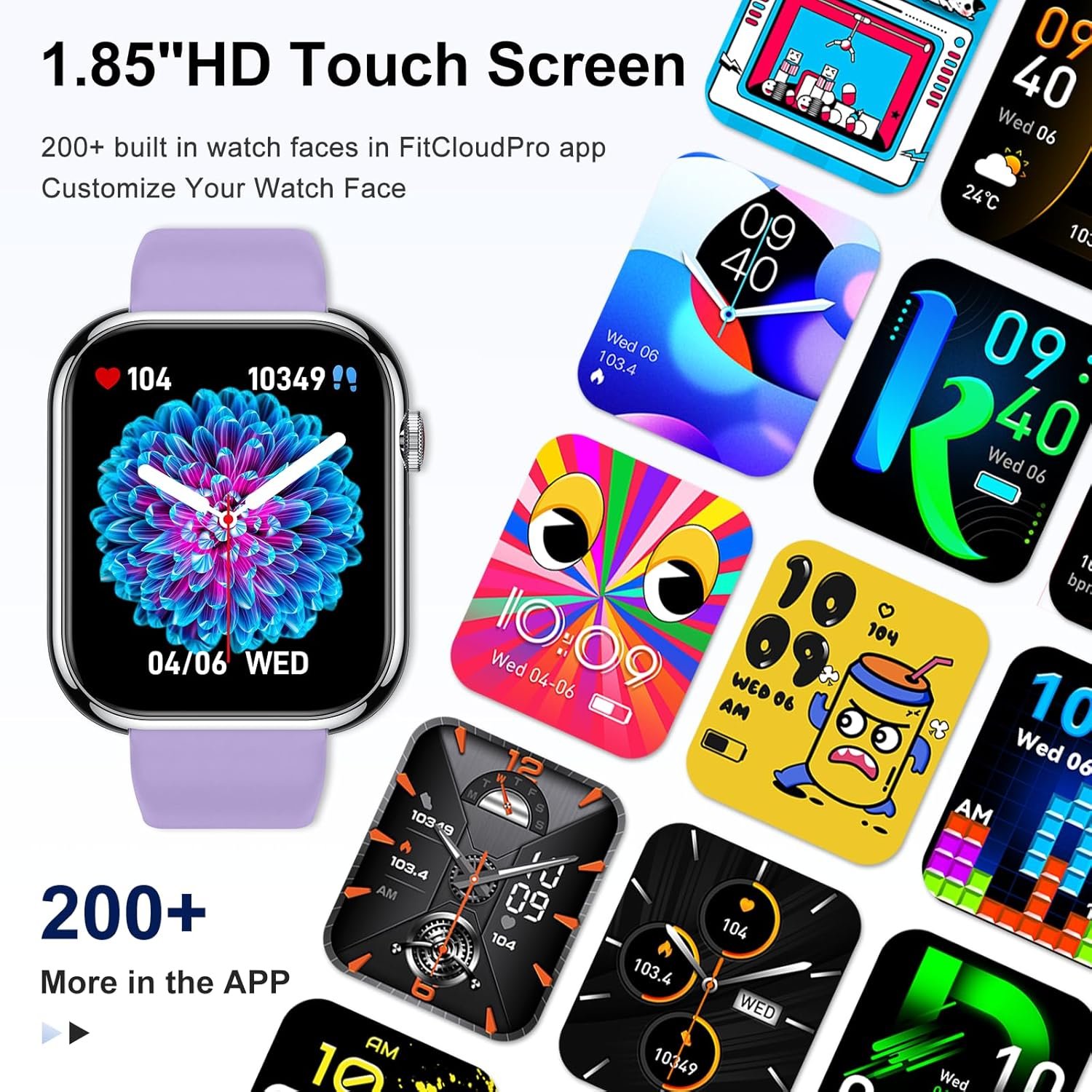 Choose from over 100 watch faces to match your style, or personalize your smartwatch with your own photos.1.85″ inch full touch screen. Watch face will light up automatically when you lift and twist your wrist.Easier to read with five levels of brightness options in the sun or dark.Smart watch come with 2 watch bands of different colors