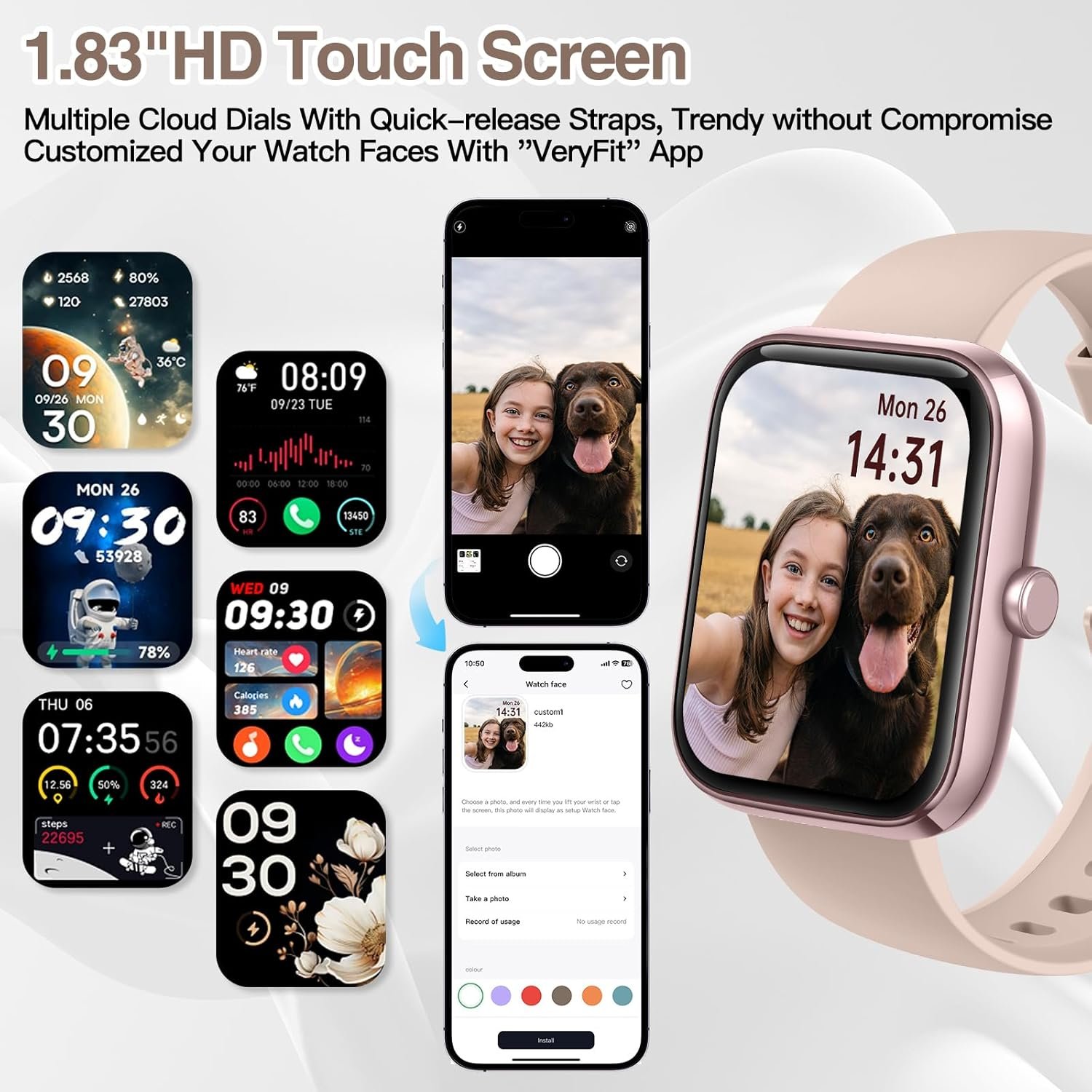 100+ Dials & 1.83″ HD Touchscreen: More than 100 cloud dials are available, covering a variety of styles and occasions, and you can also customize the dials according to your personal preferences. This VeryFit watch has a 1.83” HD touch screen. The screen glides smoothly and is very responsive. And the watch screen has five brightness levels that can be adjusted to suit different environments.
