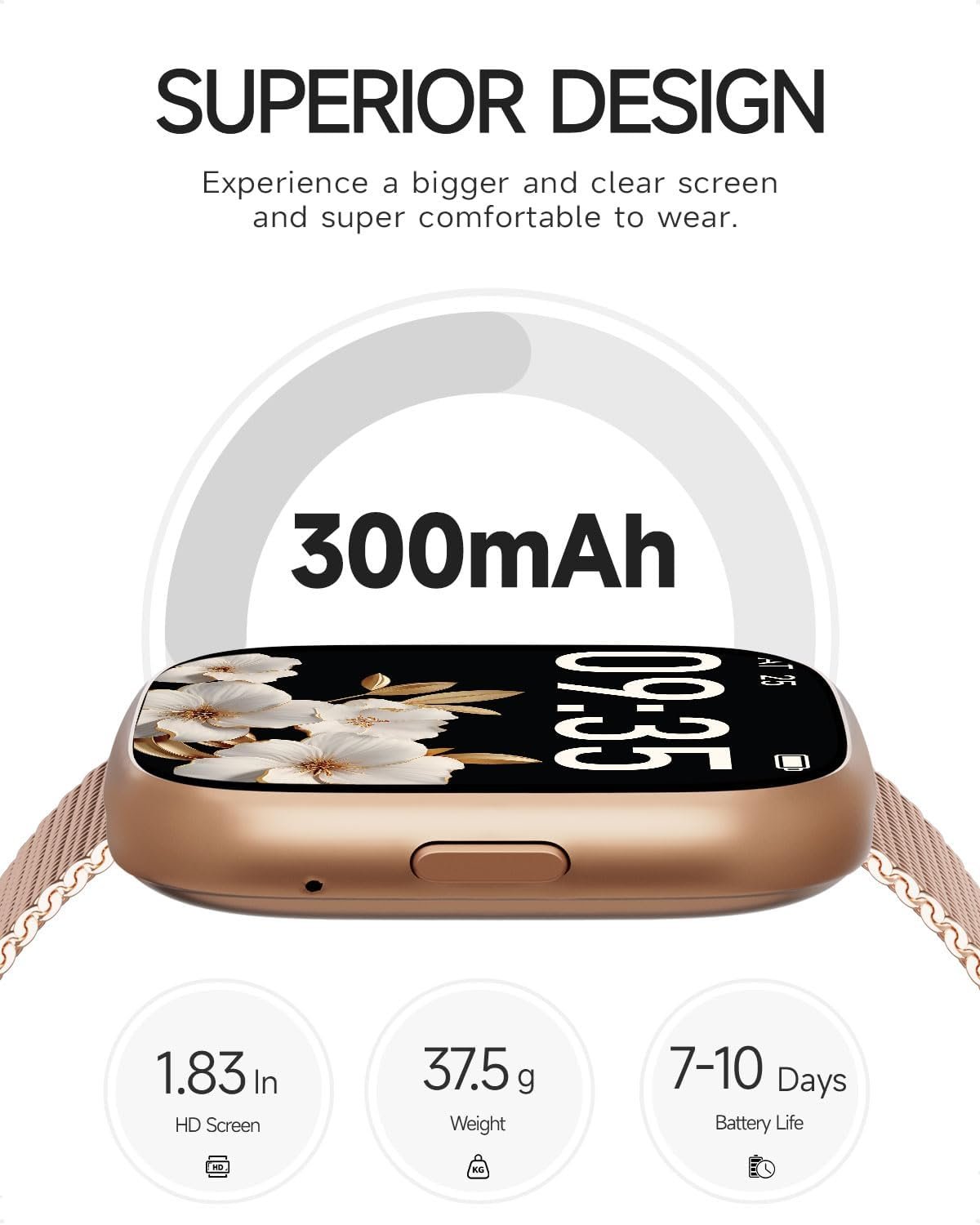 1.83″ HD Screen & Customizable Watch Face: Experience crystal-clear visuals like never before with our smartwatch’s 1.83 inch high definition screen. Upload your own photos to express your unique style whether it’s selfies or pictures of cherished moments, make your smartwatch truly your own, designed for women with discerning tastes.