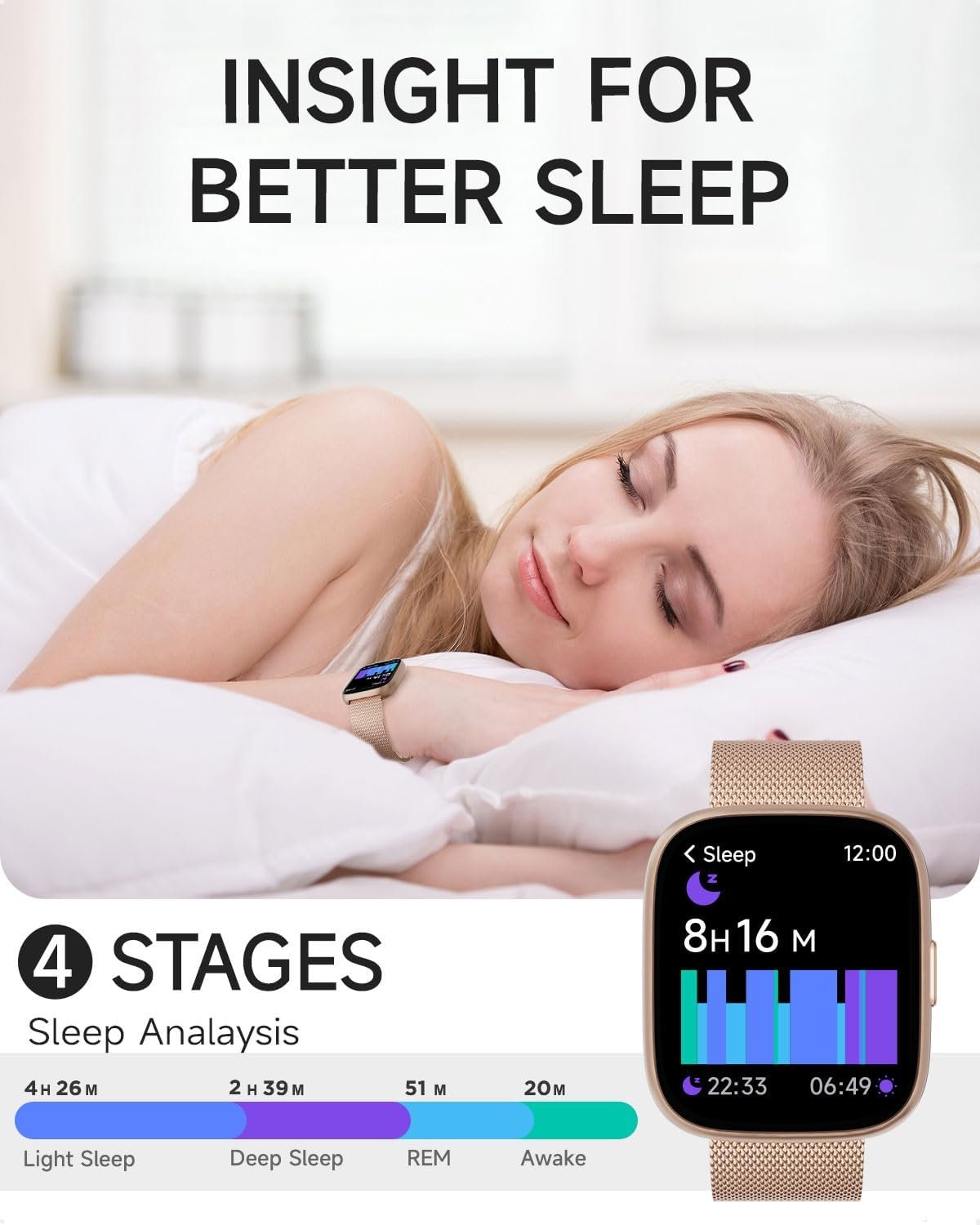 Get a Better Sleep: This sleep tracker for women monitors REM, light, and deep sleep, sending data to the “VeryFit” app for personalized insights and tips. Improve your sleep habits and wake up refreshed. Please note that more than 3 hours of sleep is required to be recorded by the test. Long-term wear is recommended!