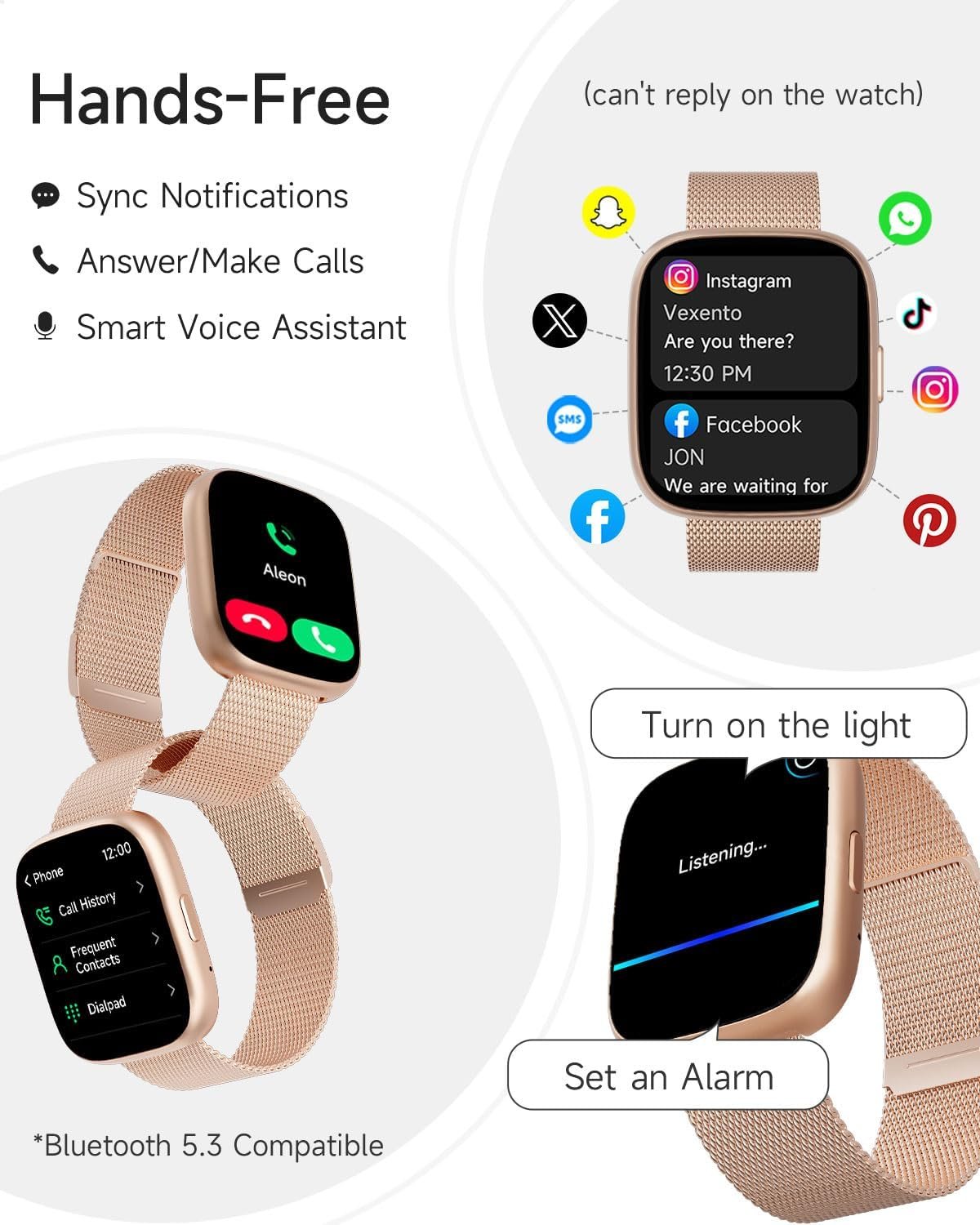 Stay connected: After connecting to your phone via Bluetooth, the smartwatch allows you to make and receive phone calls, you can also receive social media, E-mail and SMS notification right on your wrist, you will never miss any important calls or notifications whether you’re on the move or at home. Please note that this product CANNOT reply to messages!