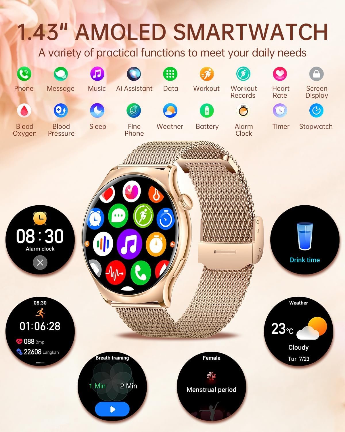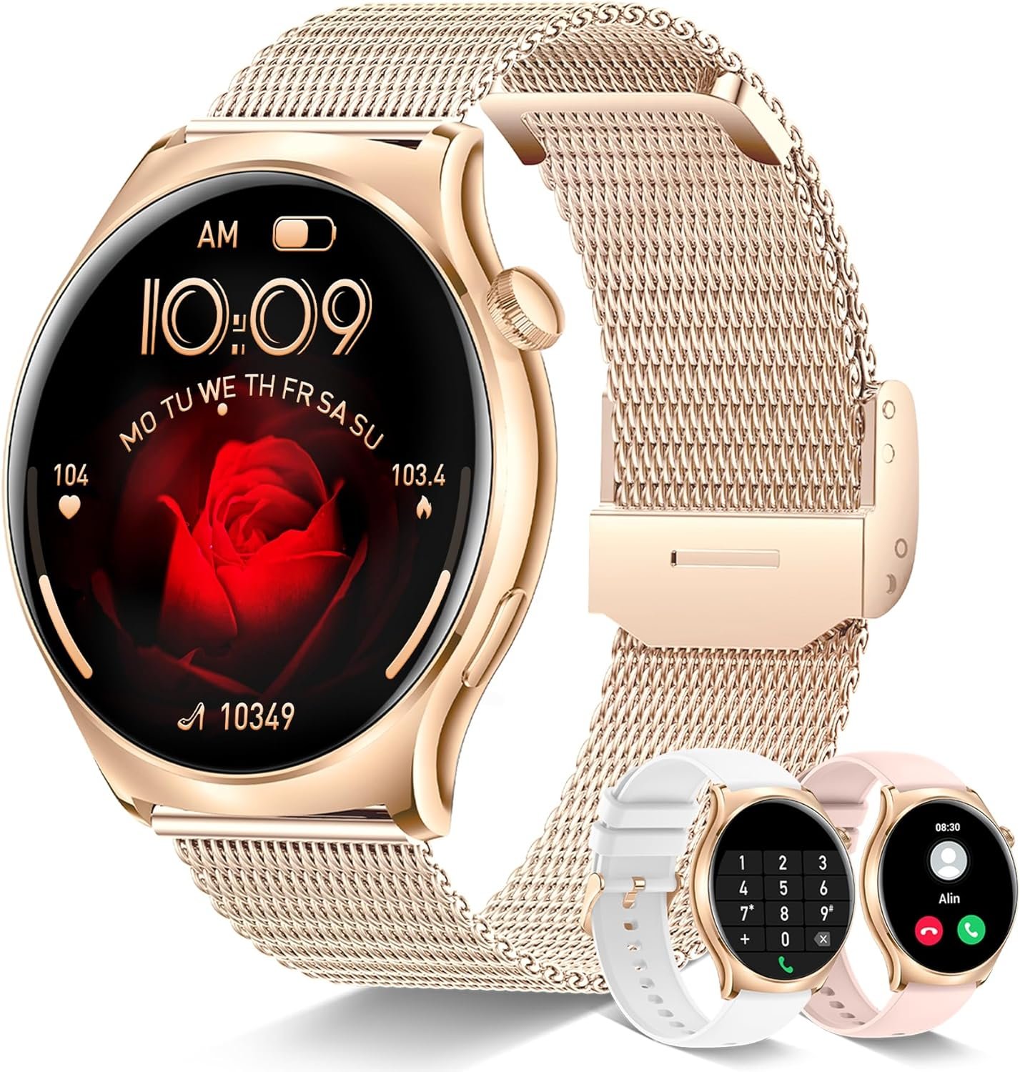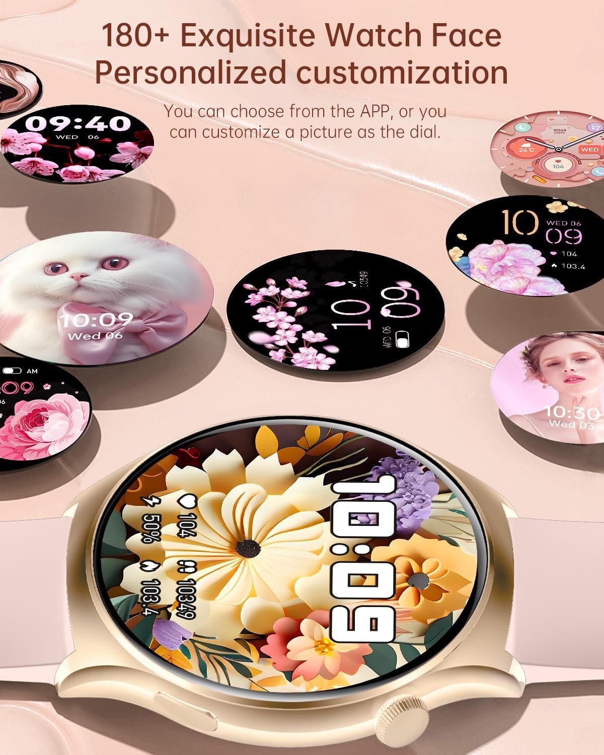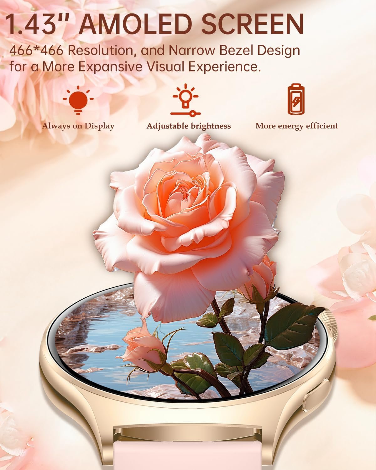 【1.43” HD AMOLED Smartwatch】Betatree smart watch for women adopts a new upgraded AMOLED display, 466*466 HD resolution, with more saturated colors, which can be seen clearly in sunlight. With the Always On Display, you can check the time without touching the screen. There are 180+ dials in the APP for you to choose from, or customized photos to create unique dials. The smartwatch round has 3 bands suitable for women who love sports and fashion.