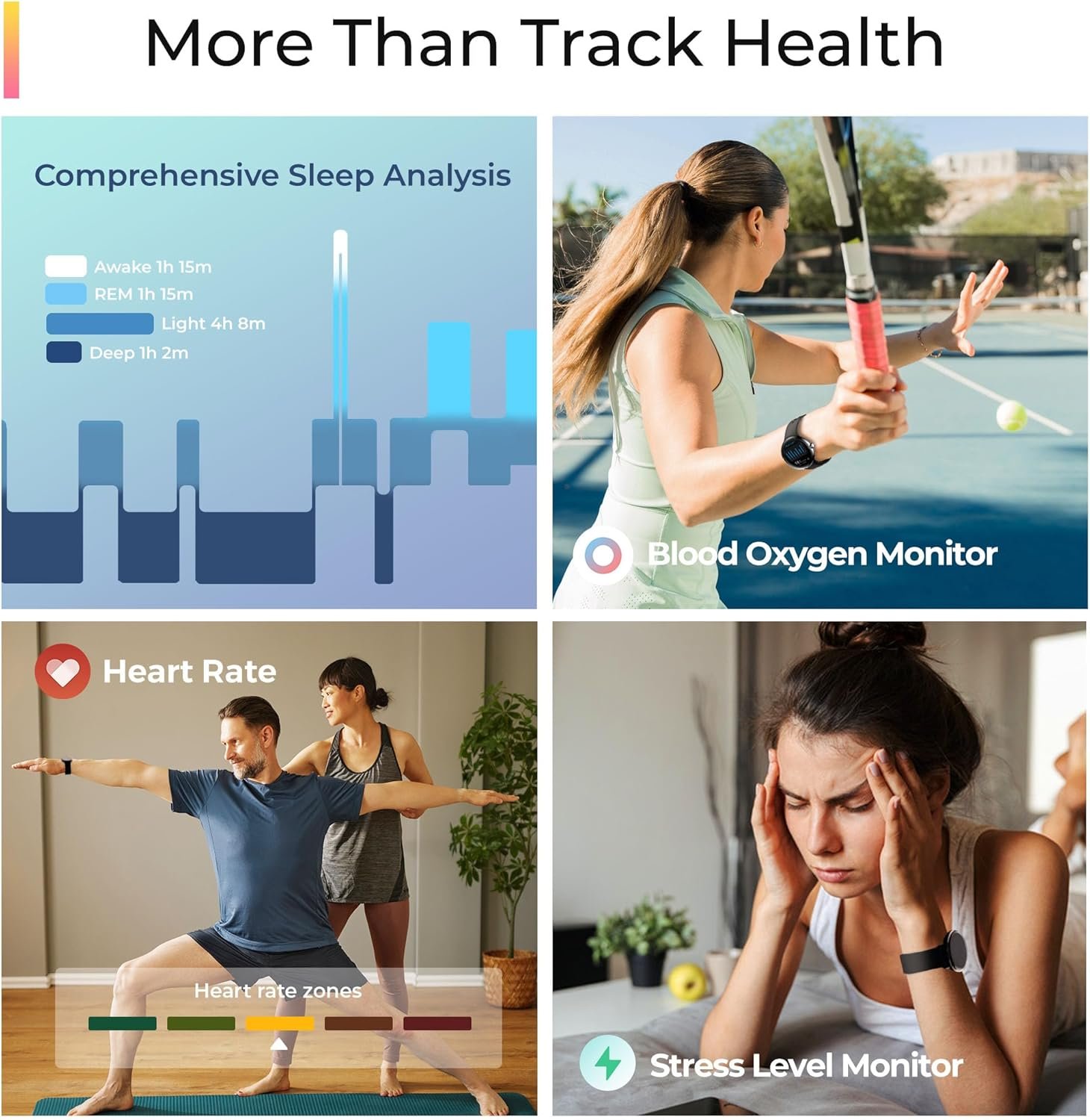 【24/7 More Than Track Health】Monitor heart rate on a 24-hour basis with accurate sensors. Support single-time SpO2 and stress level measuring. Provide high and low heart rate warnings, giving you peace of mind about overall health. Automatic sleep tracking — See the time you spent in REM, Light, and Deep sleep, as well as when you might have woken up. Generate sleep scores and sleep reports to help you make positive changes for better sleep