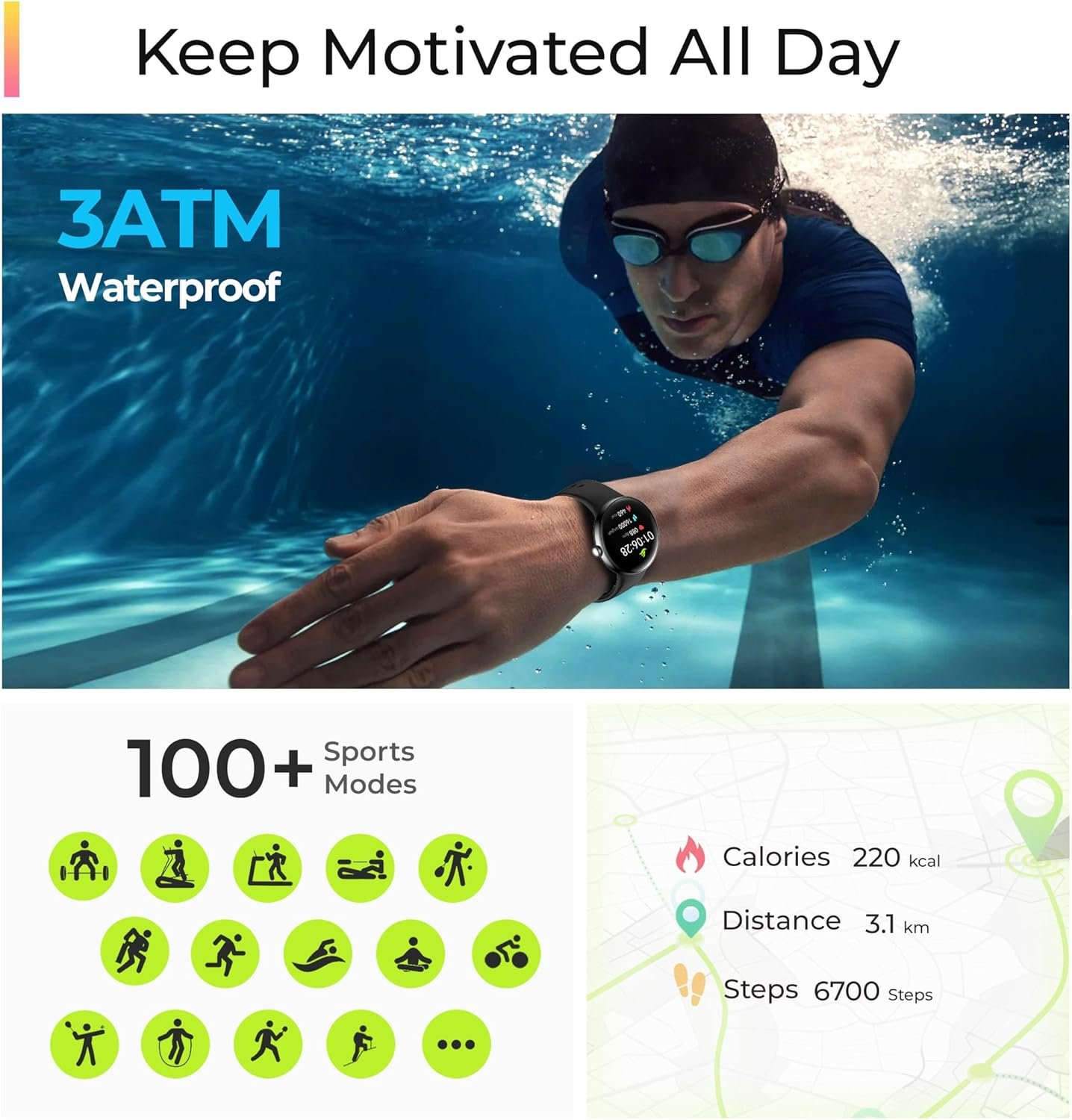 【Unleash Your Fitness Potential】Track all the workouts you’re moving — including walking, running, swimming, cycling and more. Set personalized goals — Pace/Distance/Calories, allowing you to tailor fitness metrics for every workout. The fitness tracker watch captures real-time workout data, empowering you to track progress and achieve fitness goals. 3ATM (30 meters) water resistance and excellent durability making it easy to give it all you’ve got