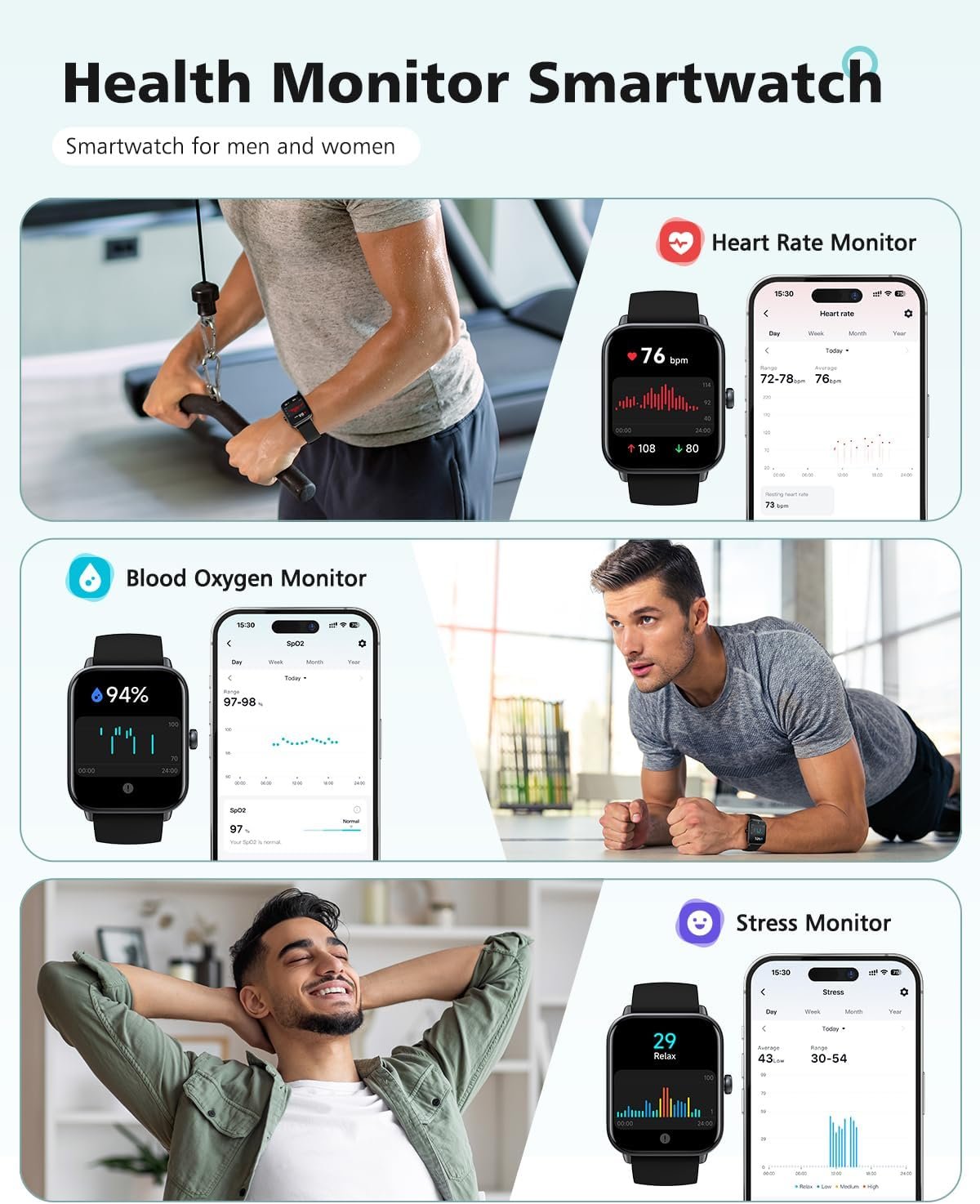 ❤️【24 Hours Health Monitoring】Sport watches for men and women equiped with high-performance optical sensors, continuously recording steps, distances, calories, and monitoring your heart rate, blood oxygen, stress level, and sleep status. Smartwatches with detailed data-based presentation to analyze and remind your body status from your wrist, offer you advice for more healthier lifestyle.