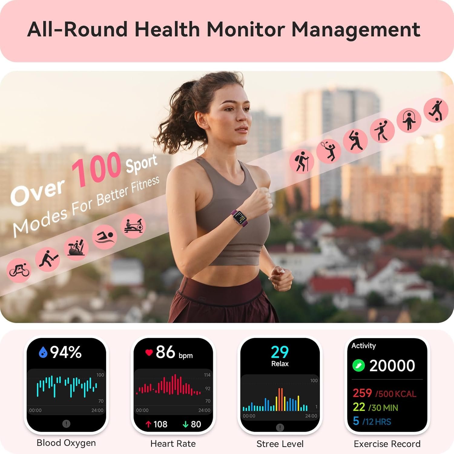 【ACTIVITY TRACKER & IP68 WATERPROOF】This fitness tracker supports over 100 popular sports modes, providing accurate and scientific data for a wide range of indoor and outdoor activities including running, cycling, swimming, baseball, basketball, fitness, yoga, strength training, and free workouts. With an IP68 waterproof rating, you can confidently use it while swimming, sweating, or washing your hands. It’s the perfect companion for all fitness enthusiasts!