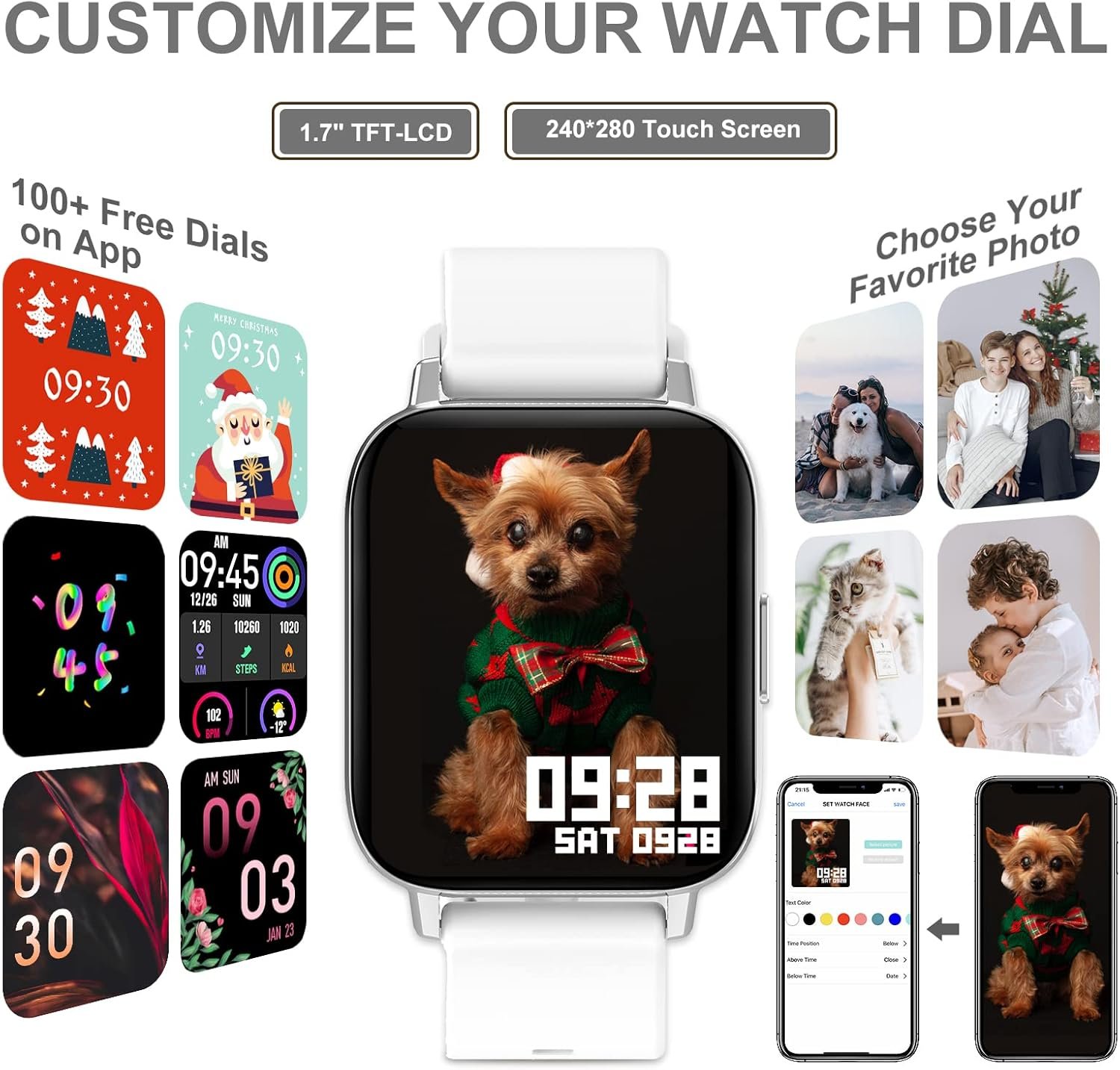 Customized Dials: Also, you can choose a photo you like to customize the watch face, such as your family, pet, etc. Make your own stylish smart watch.