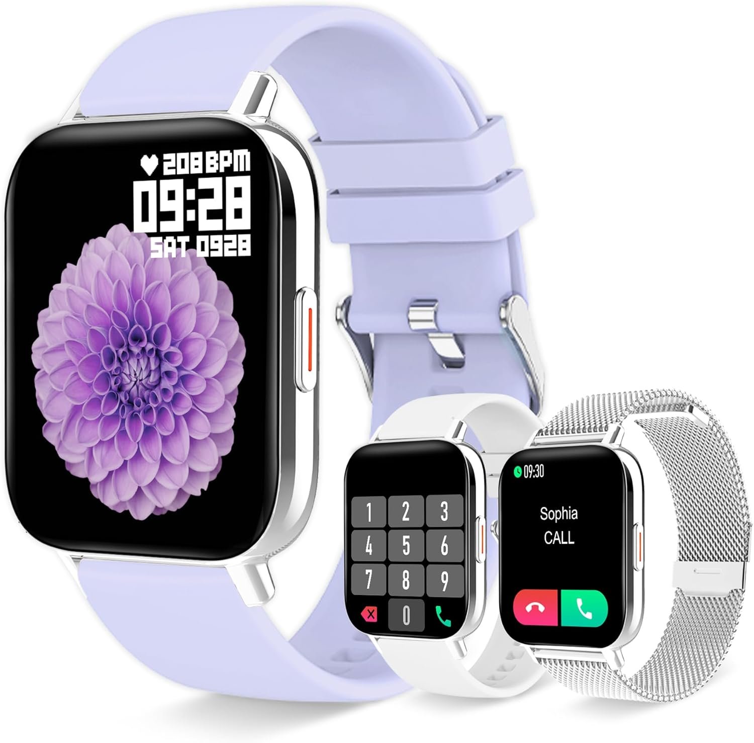 【Make Your Own Style】The smart watches for women is equipped with an ultra-thin metal frame, 1.7 inch high-definition touch screen brings smoother operating and a clearer view experience. More than 100 dials to choose from in App. Also, you can choose your favorite photo to customize the dial for true personalization. Coming with a silver stainless steel band is elegant, white & blue-violet light silicone bands are leisurely, 3 bands to suit your fitness and daily life.