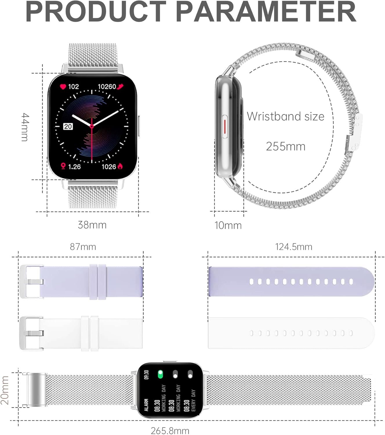 2 Color Bands: Stainless steel (Silver) & silicone bands (White & Blue-violet) are provided, so that you can match the style to your liking.