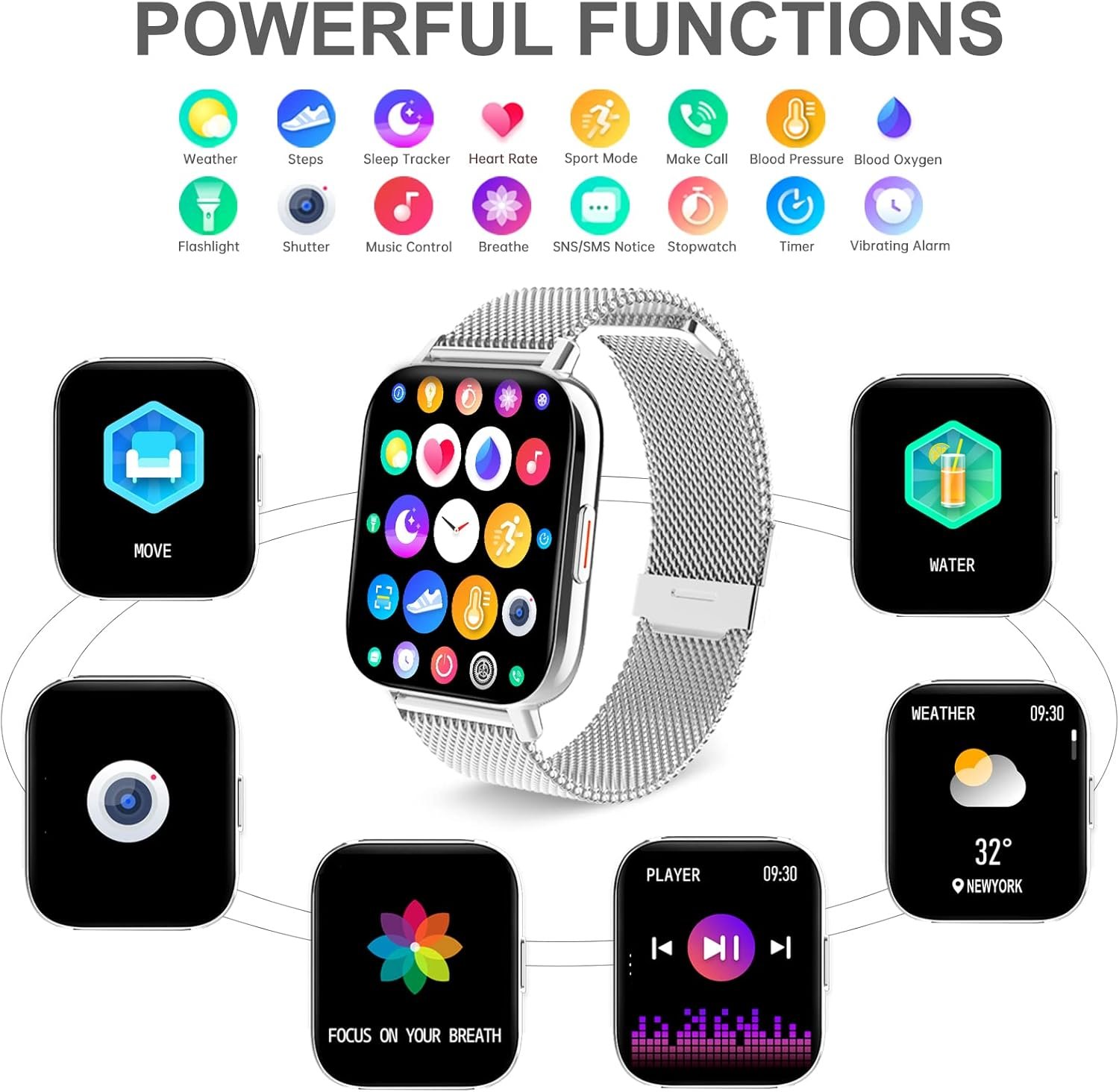 Sleep Monitor: Womens watches automatically tracks sleep time from 9 p.m. to 9 a.m. It will record and analyze your sleep state, light sleep/deep sleep/wake up. The data will be recorded on the APP.24/7 Heart Rate Monitor: Heart Rate watch can monitor heart rate automatically every 5 minutes all day. Tracking your heart rate data during exercise to get the best out of your workout.Boold Oxygen Monitor: Monitoring your Spo2 levels, learn about the body’s ability to absorb oxygen and the amount of oxygen delivered to the body, and help you live a healthier lifestyle.Blood Pressure Monitor: Sport watch directly monitor and show your blood pressure and are recorded on the App at any time, anywhere.Women’s Health: Womens watch can help you keep track of your menstrual cycles and ovulation periods, and alert you before they arrive.