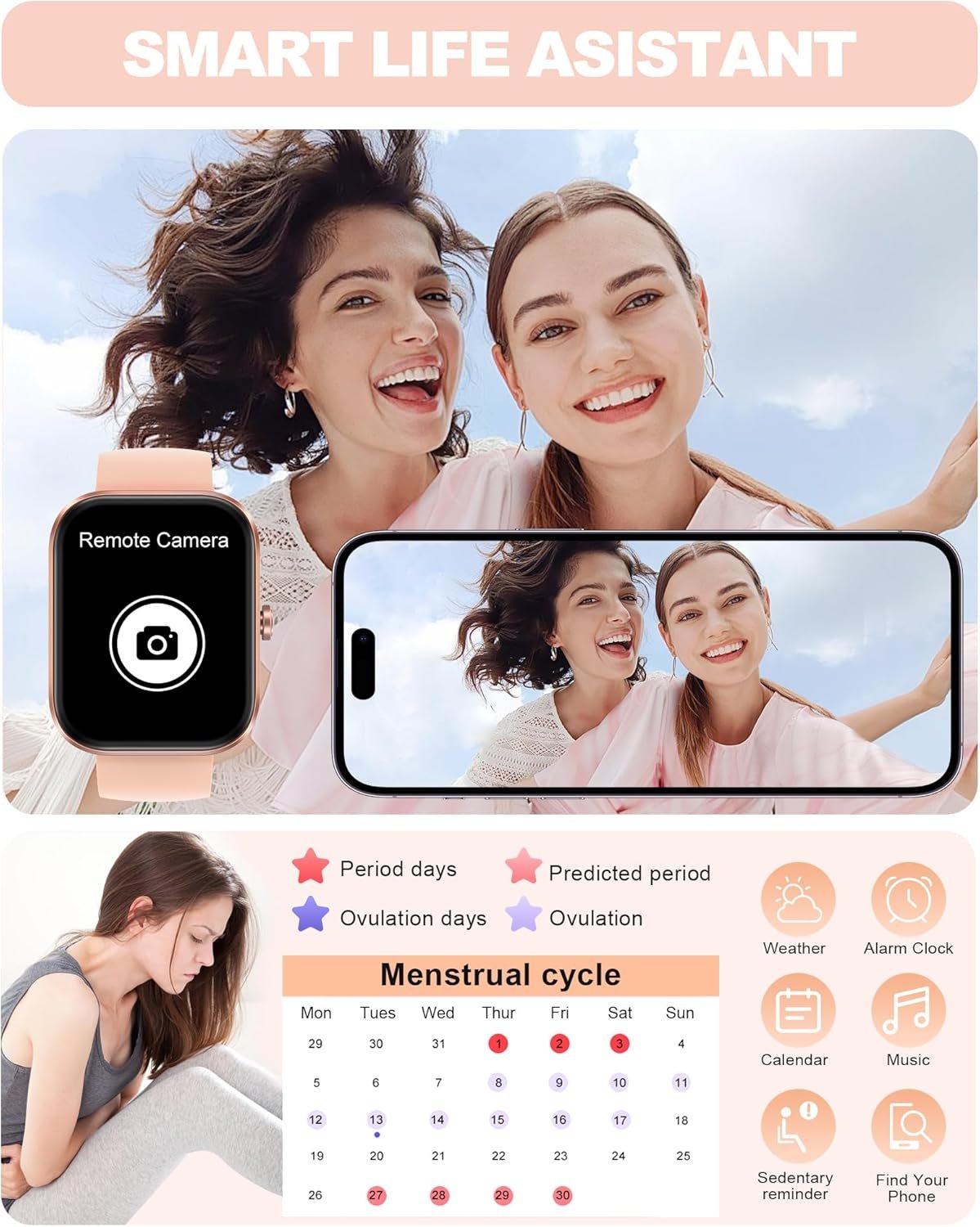 Multifunctional & Long Endurance: The smart watches for women has multiple functions, such as weather forecasting, music control, calendar, breathing exercises, timer, alarm clock, phone finder, and female cycle tracking. The Smartwatch takes 2 hours to charge and has a normal usage time of 5-7 days, with a standby time of about 30 days.