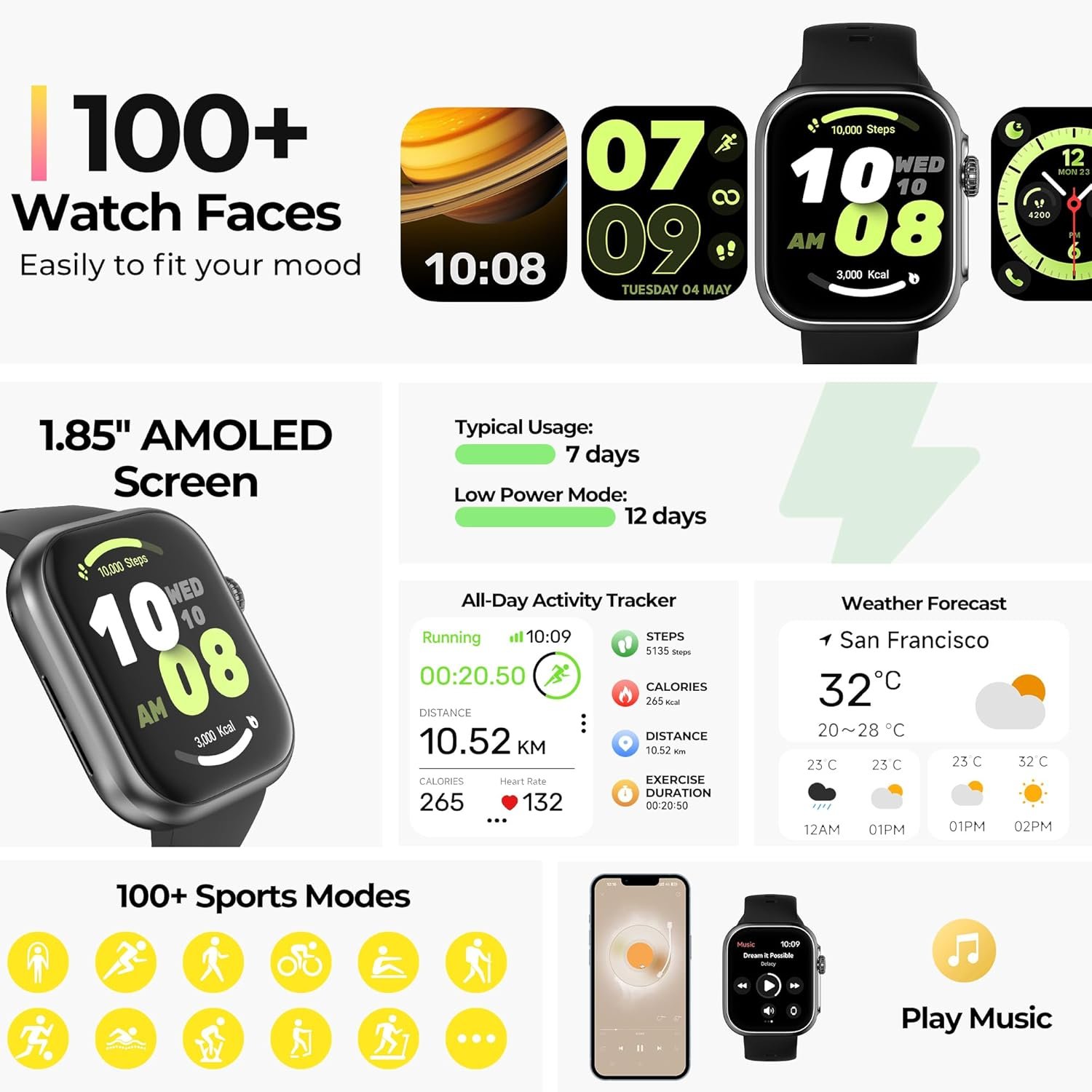 【1.85” Ultra HD Display, Change at Your Will】2024 innovative smartwatch with up to 336 ppi — provides unprecedented clarity. Maximum brightness up to 1200 nits — read easier even in full sun. Ultra-large 1.85″ display allows you to view everything at a glance and enjoy seamless interactions. 100+ watch faces to choose from, support customized from phone photos. Quick-release strap can be replaced easily to fit your mood. *Smart watch for men women fits wrists 5.5”/14cm – 7.8”/20cm