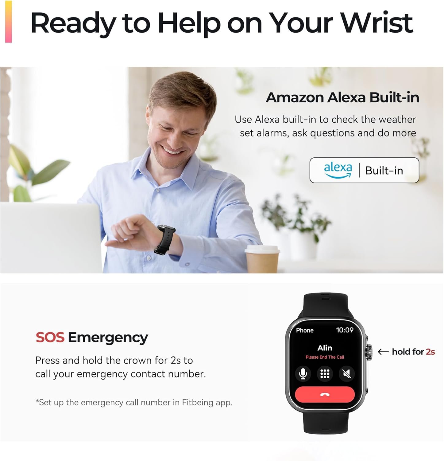 【Extended Battery Life, More to Discover】Up to 7 days of battery life in typical usage, 12 days in low power mode on a full charge. The easy-to-use smart watch covers a number of functions, including no-disturb, power saving mode, water lock, eject water, flashlight, weather, music, timer, alarm etc. Support SOS emergency call feature (*set crown function in Fitbeing app), allowing you to quickly reach out for help when you need it
