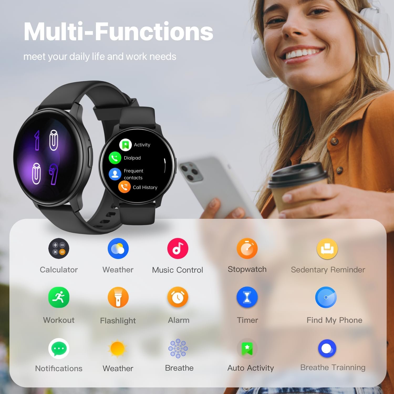 Activity Tracking: This sport smart watch cover all daily exercise, can be real-time record calorie consumption, steps, distance, speed, you can set a reasonable exercise goal, to provide you with more effective exercise guidance.