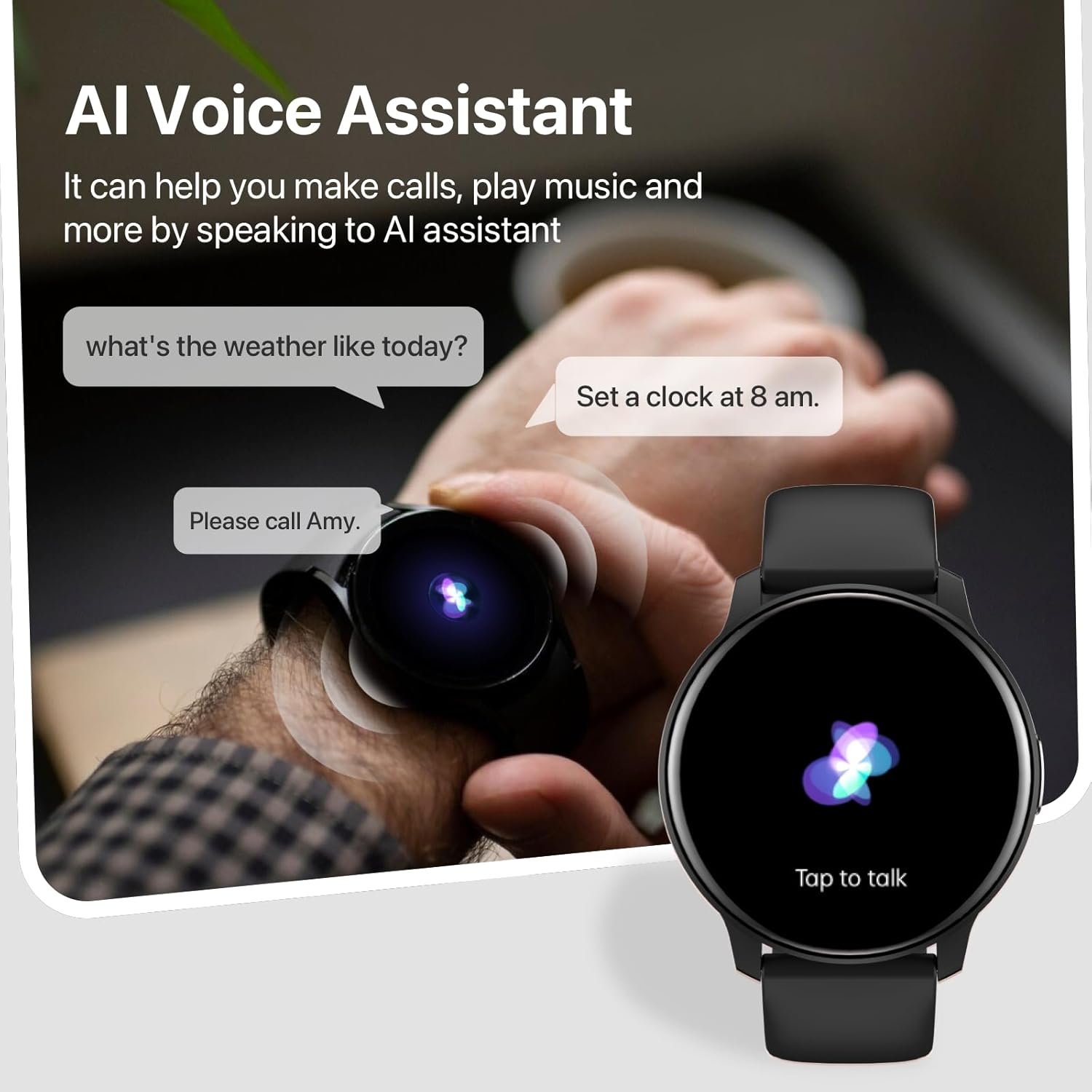 Ai Voice Assistant: this Ai voice control smart watch can help you work with your smart phone Ai assistant, you can speak with this smart watch to make call, check the weather, control music ,set alarm etc.