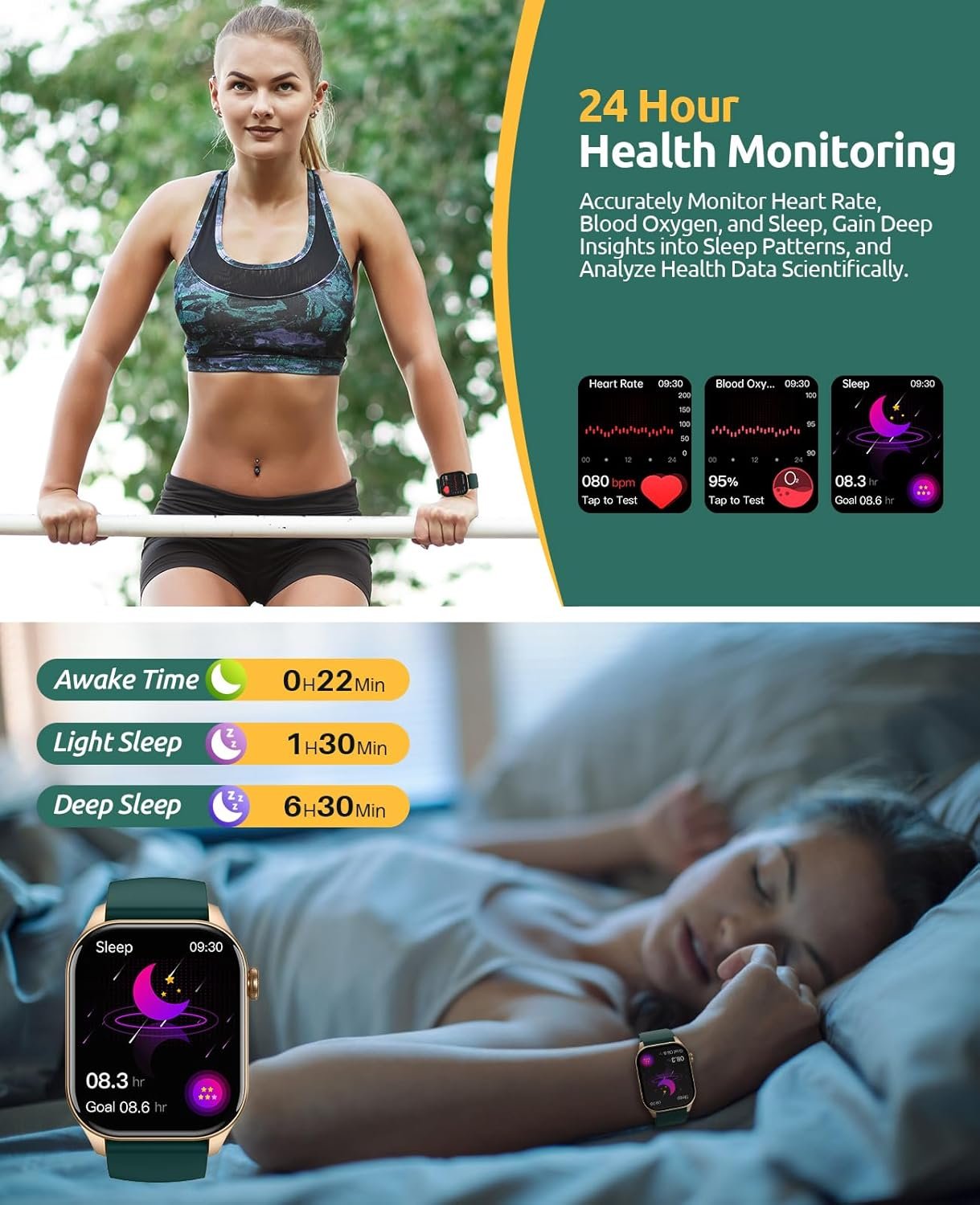 【24/7 Health Monitoring】This smartwatch uses advanced sensors to monitor heart rate, blood oxygen(Sp02) and sleep quality throughout the day. It also provides functions such as female menstrual cycle tracking, breathing training, sedentary reminders, and drinking water reminders to help you better manage your health.