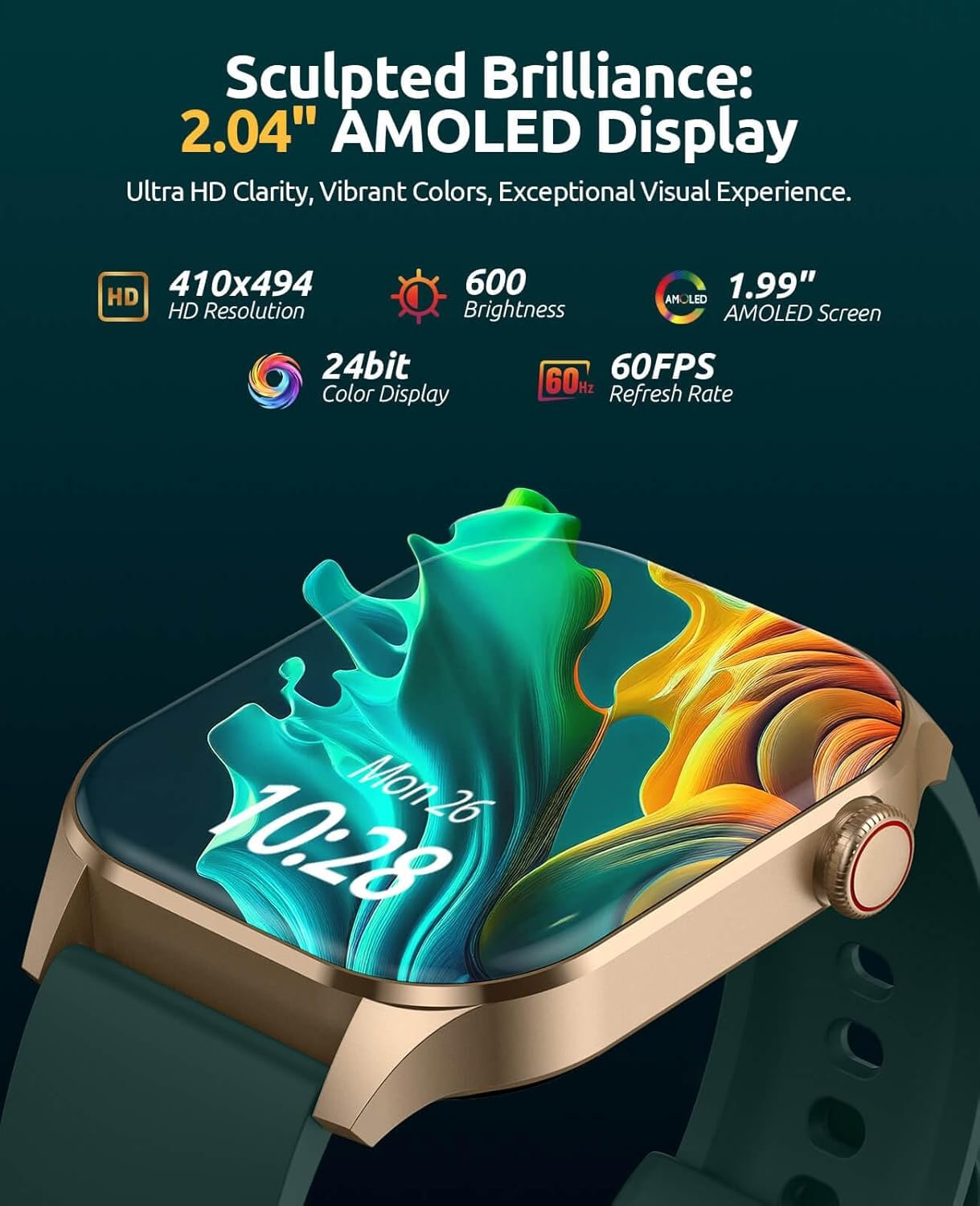 【2.04” HD Touch Screen & Personalized Watch Face】SOUYIE smartwatch adopts 2.04-inch AMOLED super retina full touch screen with a resolution of 336*448, providing excellent image quality and high-sensitivity touch. You can also express your personality with a variety of free watch faces or a fully customizable watch face.