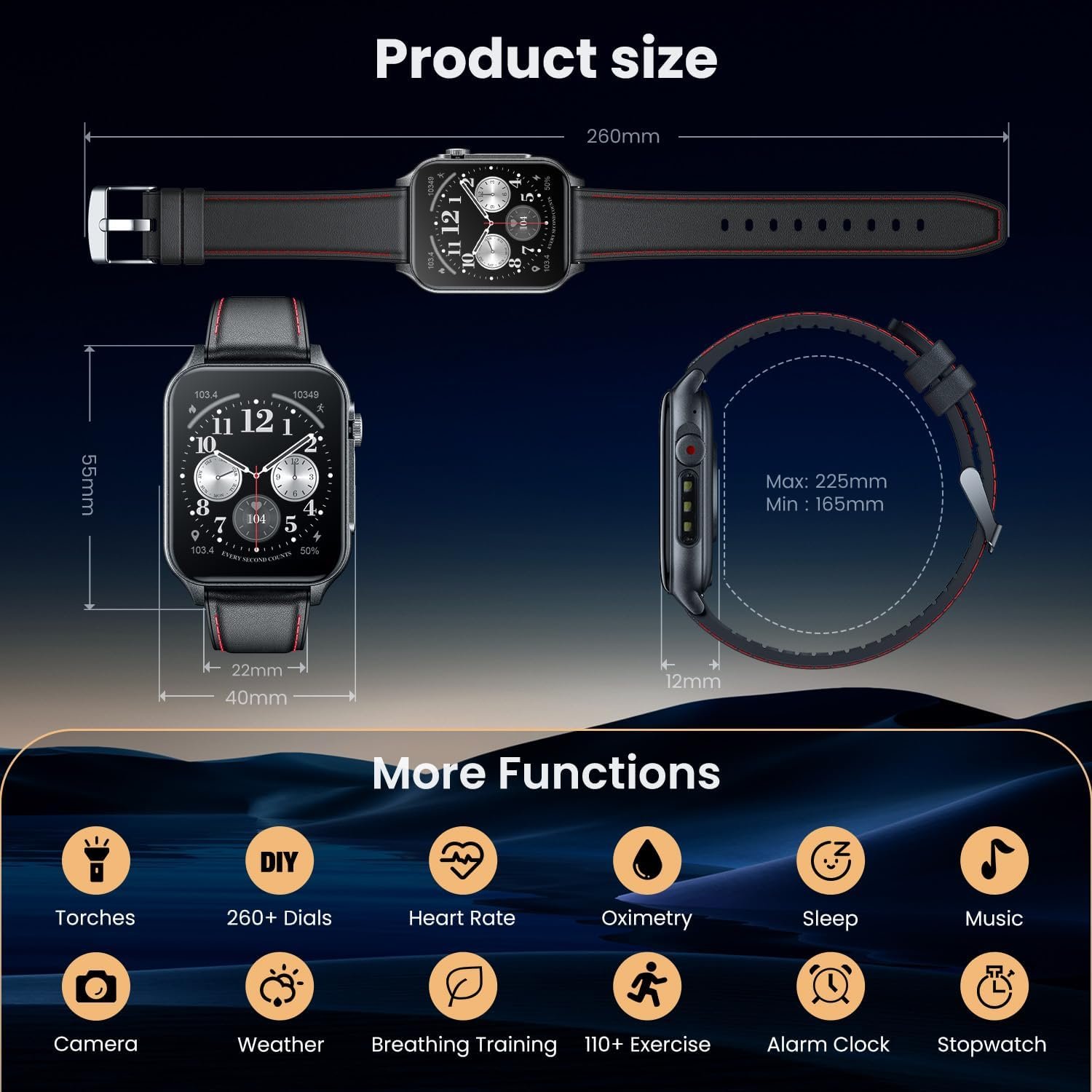 Smart watches for men features include calls (answering and dialing), address book, call logs, voice assistant, sports data, exercise, flashlight, heart rate, sleep, blood oxygen, weather, music control, breathing training, stopwatch, timer, alarm, calendar, calculator, find phone, brightness adjustment, screen off time, screen on time, battery capacity display, dial, sound and vibration, multi-language, password, drinking water and sedentary reminders, etc. smartwatch men meet your daily needs