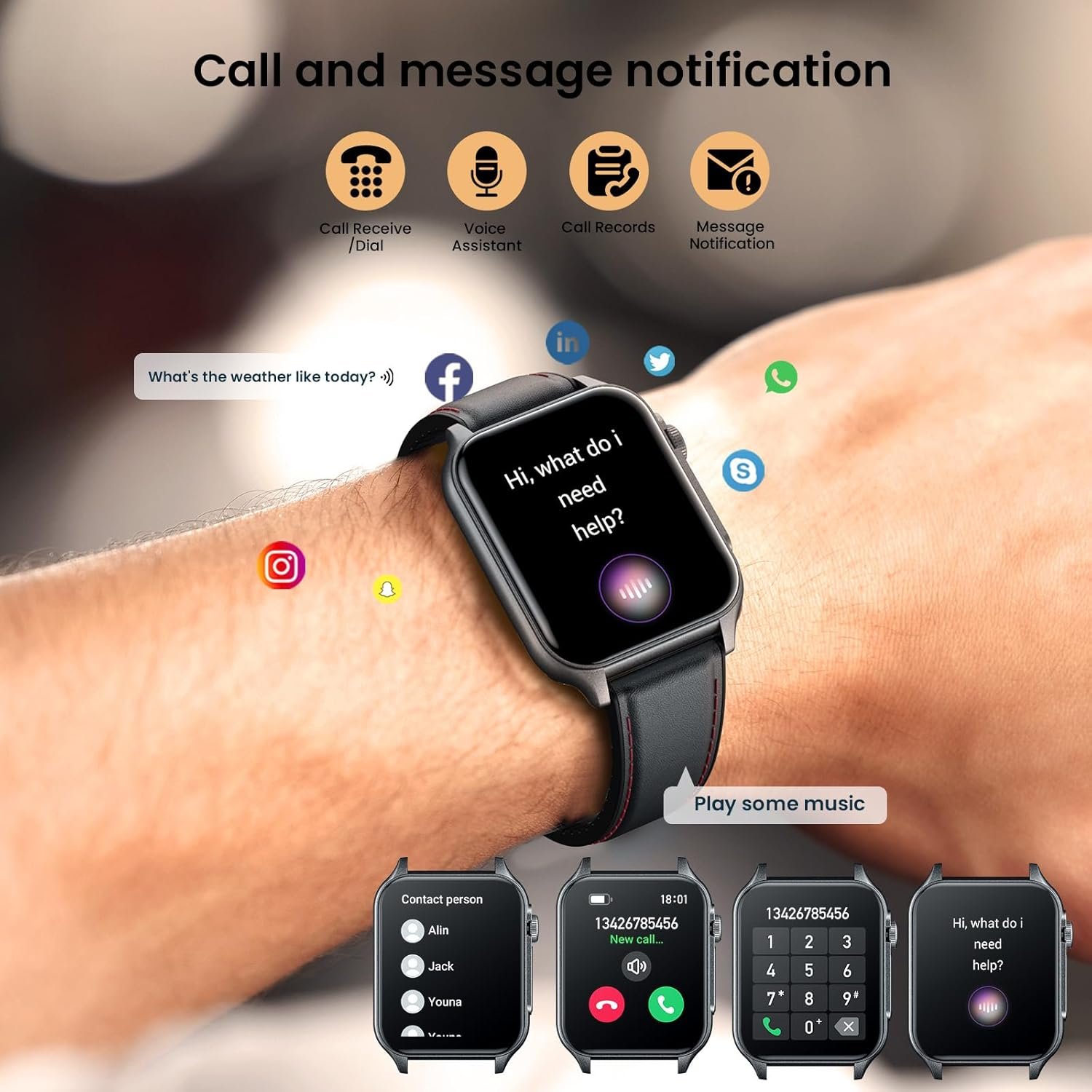 Smart watch answer/make calls, just connect the fitness watch to the mobile phone to make a call on the without inserting a SIM card. watch for men can synchronize SMS, email, Facebook, WhatsApp, Twitter, linkedln, Instagram, snapchat, kakao talk, skype and other information reminders, not miss any important information. mens watches can set 5 different time period alarm clocks and synchronize them to the watch through the mobile phone APP, also has water drinking reminder and sedentary reminder