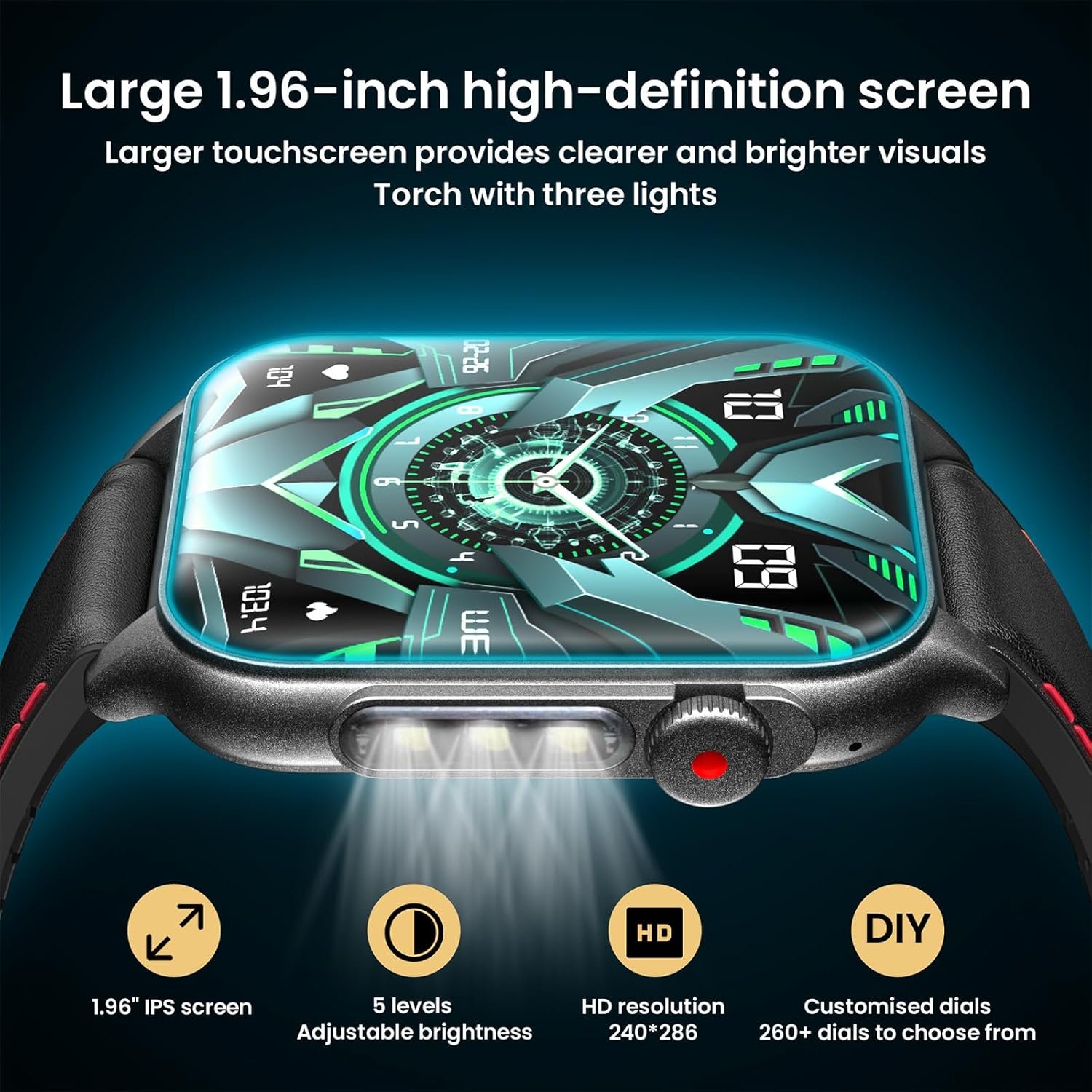 Big screen smart watch 1.93″ full touch screen plus buttons, resolution 240 * 286. black watches for men with three lights flashlight, pull down the main interface, click the flashlight icon, the light is always on, and the irradiation range is wide. activity trackers and smartwatches 300mah battery, extra long standby. (note: The actual situation is subject to personal use) fitness tracker smart watch Compatible with most smartphones, smart watch for android phones and ios 8.0 ~ 12.0 and above