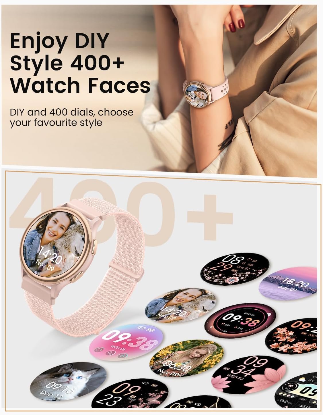More Chic, More Style: This chic smart watches for women offers over 400 stunning watch face designs, letting you switch effortlessly to match your mood and outfit. With customizable photo options, along with a stylish woven strap and two soft silicone bands, it’s your perfect companion for gym sessions, weekend relaxation, or party nights. Your smart watch isn’t just an accessory – it’s a reflection of your individual style, seamlessly fitting into your life!